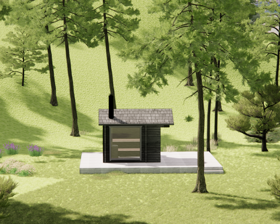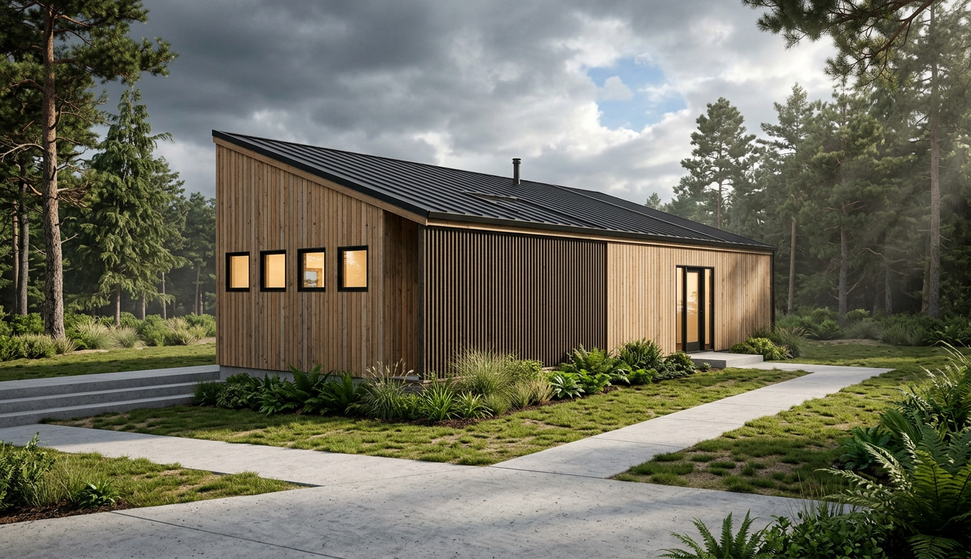 render a photorealistic 3d perspective of this house the current material style keep model geometry the same windows doors roof walls make a green meadow with moss gray several pine trees around looks native to swedsih forest do not change relief do not change the view only enhance the current materials and make the landscape nicer vegetation detailed textures in the wood siding and a vibrant clear sky with light atmospheric depth render in hyper realistic architectural visualization quality 8k resolution