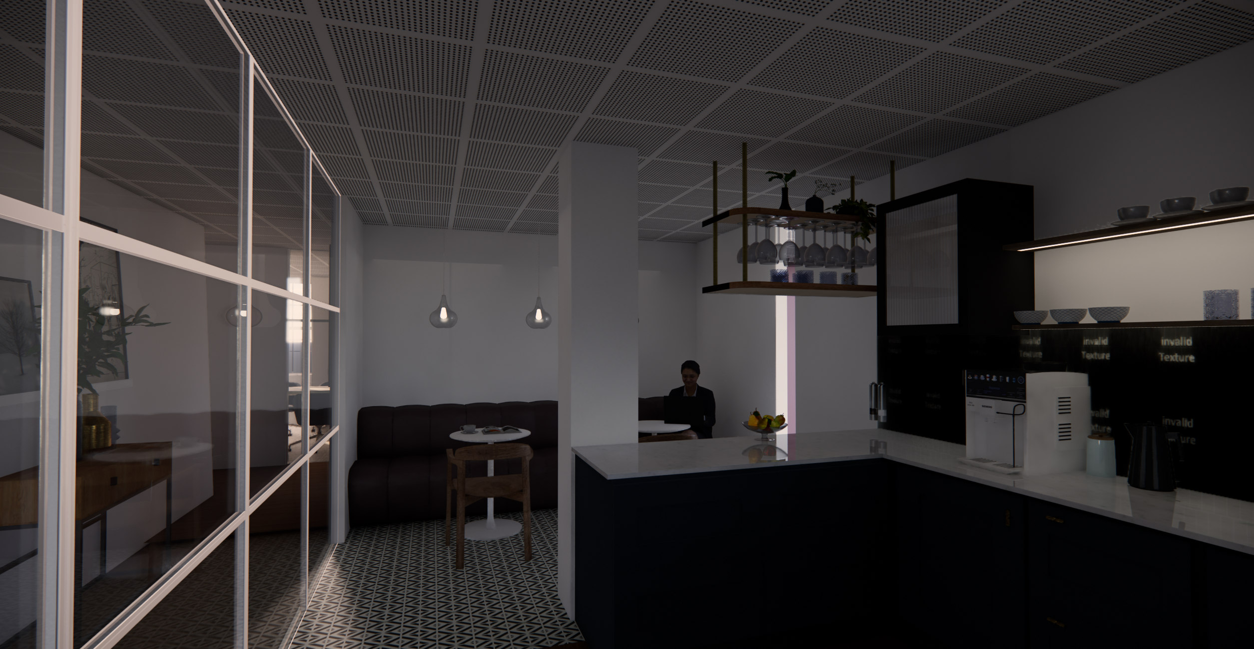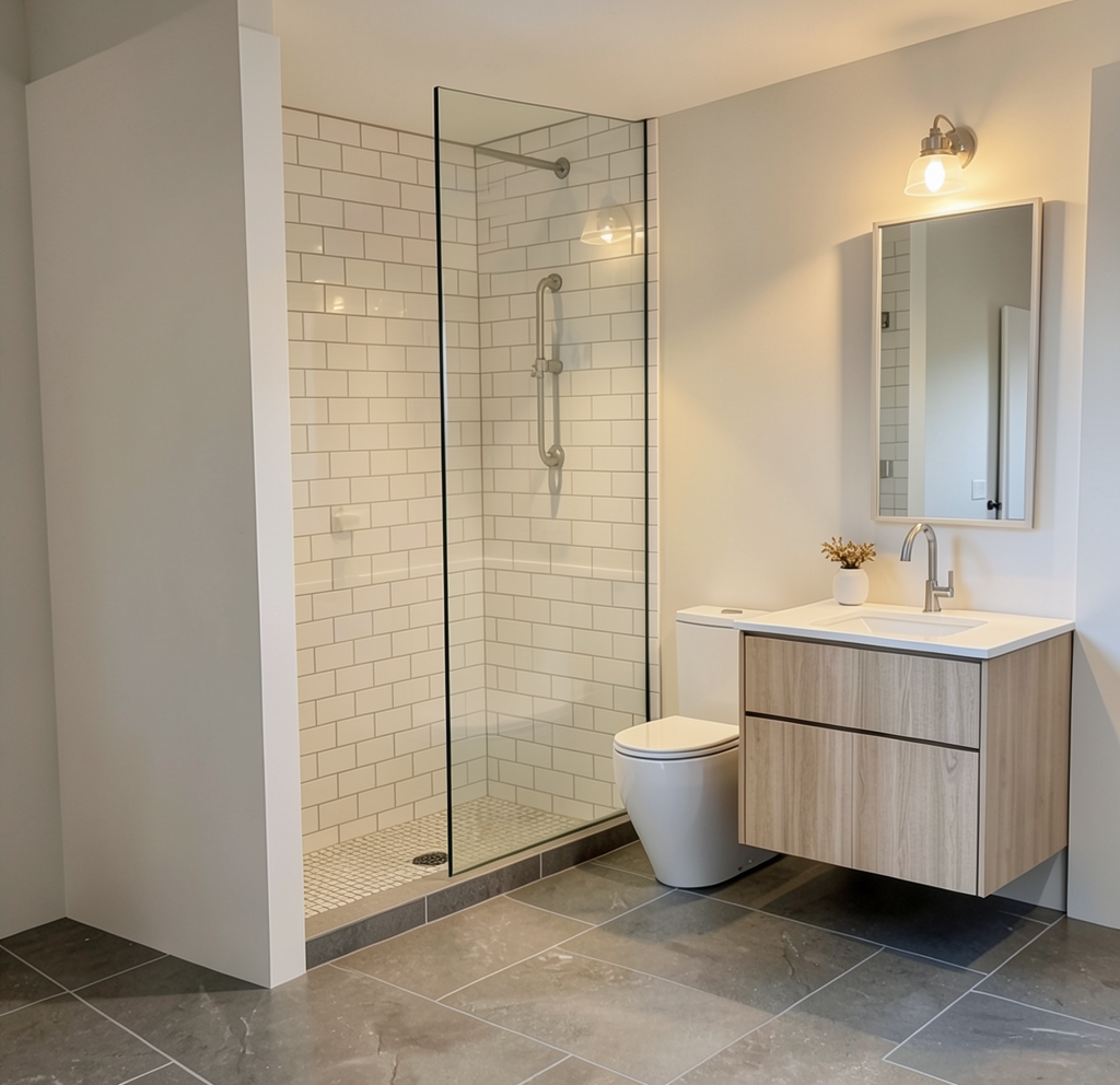 interior shot a modern minimalist bathroom design darker oak flooring complements a light wood grained vanity and a cabinet with matte black handles a glass shower enclosure with elegant brass fittings completes the design the atmosphere is calm and relaxing accented by lush green plants hanging in black pots the lighting is soft and natural creating a relaxing spa like atmosphere the mirror is backlit the shower alcove with four shelves is illuminated from top to bottom by an led strip the fixtures are brushed copper the mirror reflects the smooth frameless white door