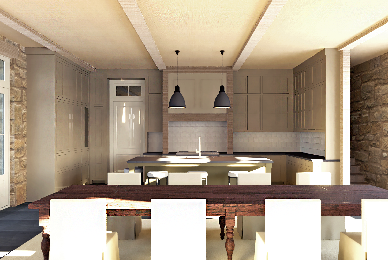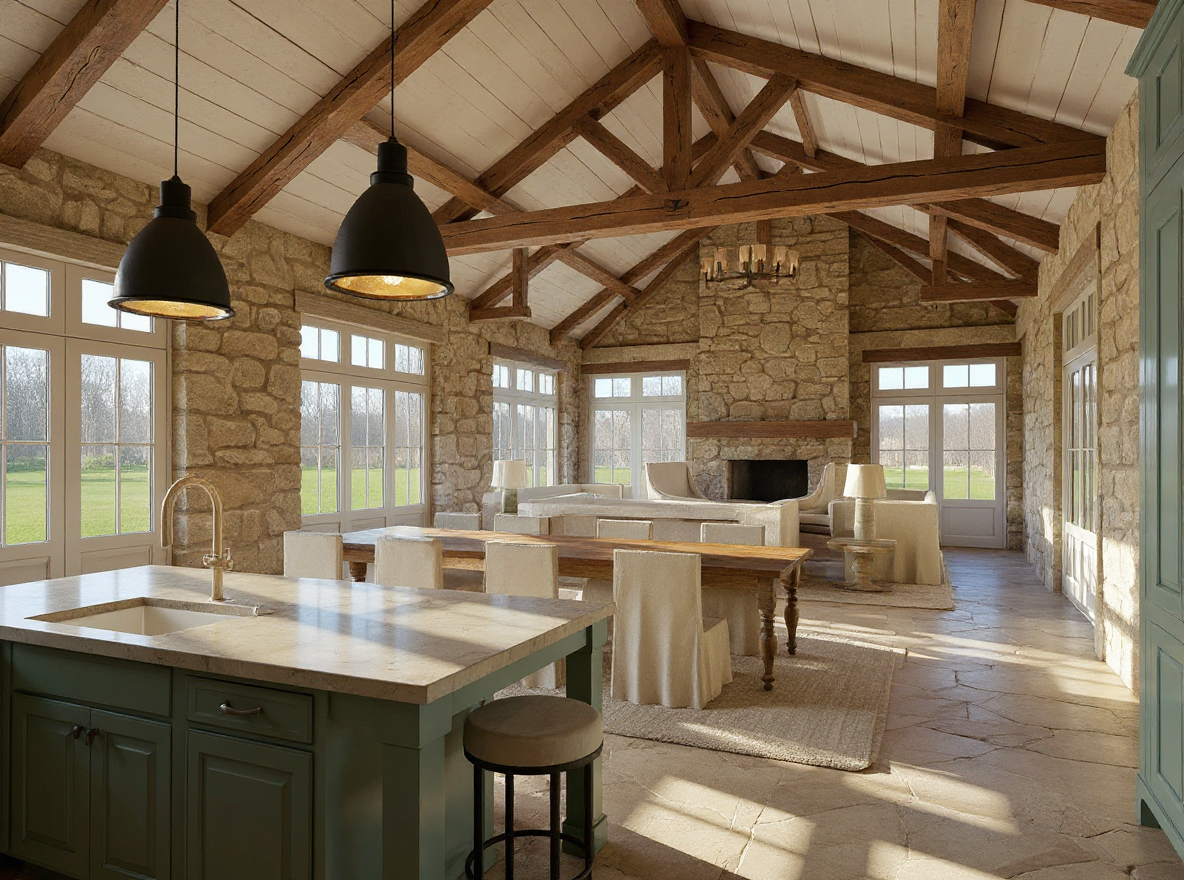 keep existing architecture as is equestrian french country aesthetic white stained beadboard on vaulted ceiling rough hewn wood beams taupe cabinetry in kitchen