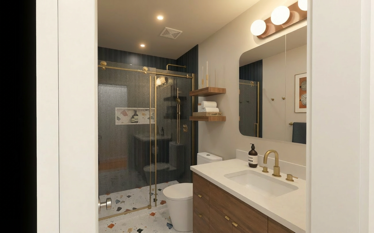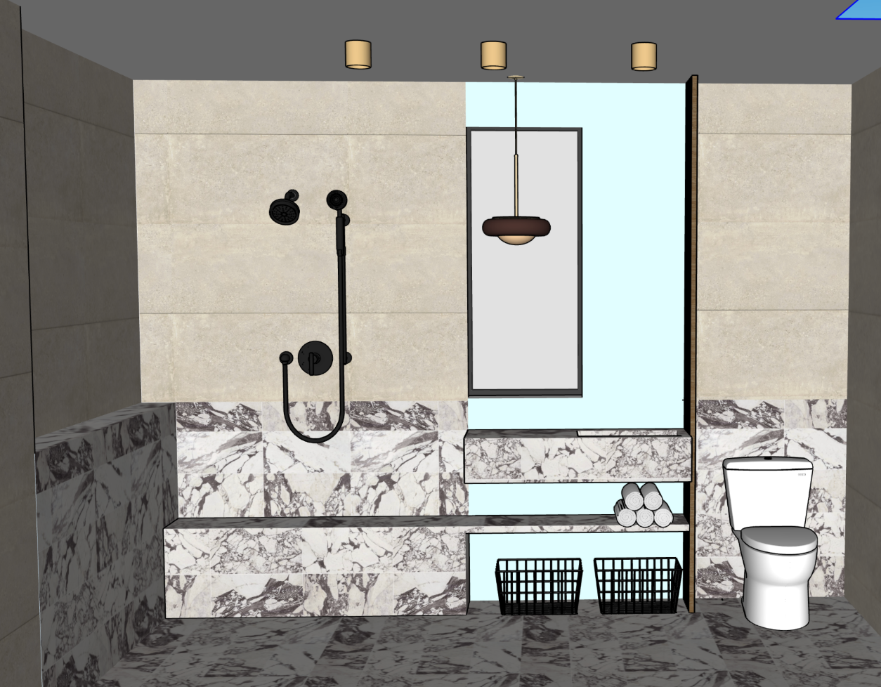 use this exact image as the base do not change layout and architecture placement of shower bench toilet and vanity window location to the left of the vanity mirror placement overall proportions and camera angle apply the following material and design enhancements materials apply calacatta marble to the shower walls bench and bathroom floor large slab look minimal grout lines high end soft polished finish not overly glossy warm white base with elegant gray veining keep upper wall areas in a soft warm neutral plaster or large format tile light creamy tone introduce subtle contrast between marble and upper wall for depth vanity wall maintain mirror centered on wall add a single pendant hanging on the right side of the mirror warm aged brass or bronze finish soft frosted or opal glass globe minimal modern spa like design keep window to the left of the vanity add soft diffused daylight coming through not bright slightly muted lighting very important create a moody spa lighting environment add soft recessed ceiling lighting warm temperature 2700k dimmed low gentle ambient glow not bright or flat pendant emits a warm soft glow focal lighting add subtle indirect lighting under bench or behind vanity for a soft floating effect lighting should be layered soft highlights on marble gentle shadows in corners no harsh or even lighting color tone slightly desaturate overall tones for a calm spa like palette add warmth to materials no cool blue lighting atmosphere moody but serene soft shadow gradients calm quiet high end spa feel add subtle steam haze effect in the shower area for atmosphere very light not foggy styling add minimal spa styling rolled white towels on bench or shelf simple vessel or tray with neutral accessories keep clean and uncluttered overall style luxury spa bathroom moody warm and calming high end resort wellness retreat aesthetic
