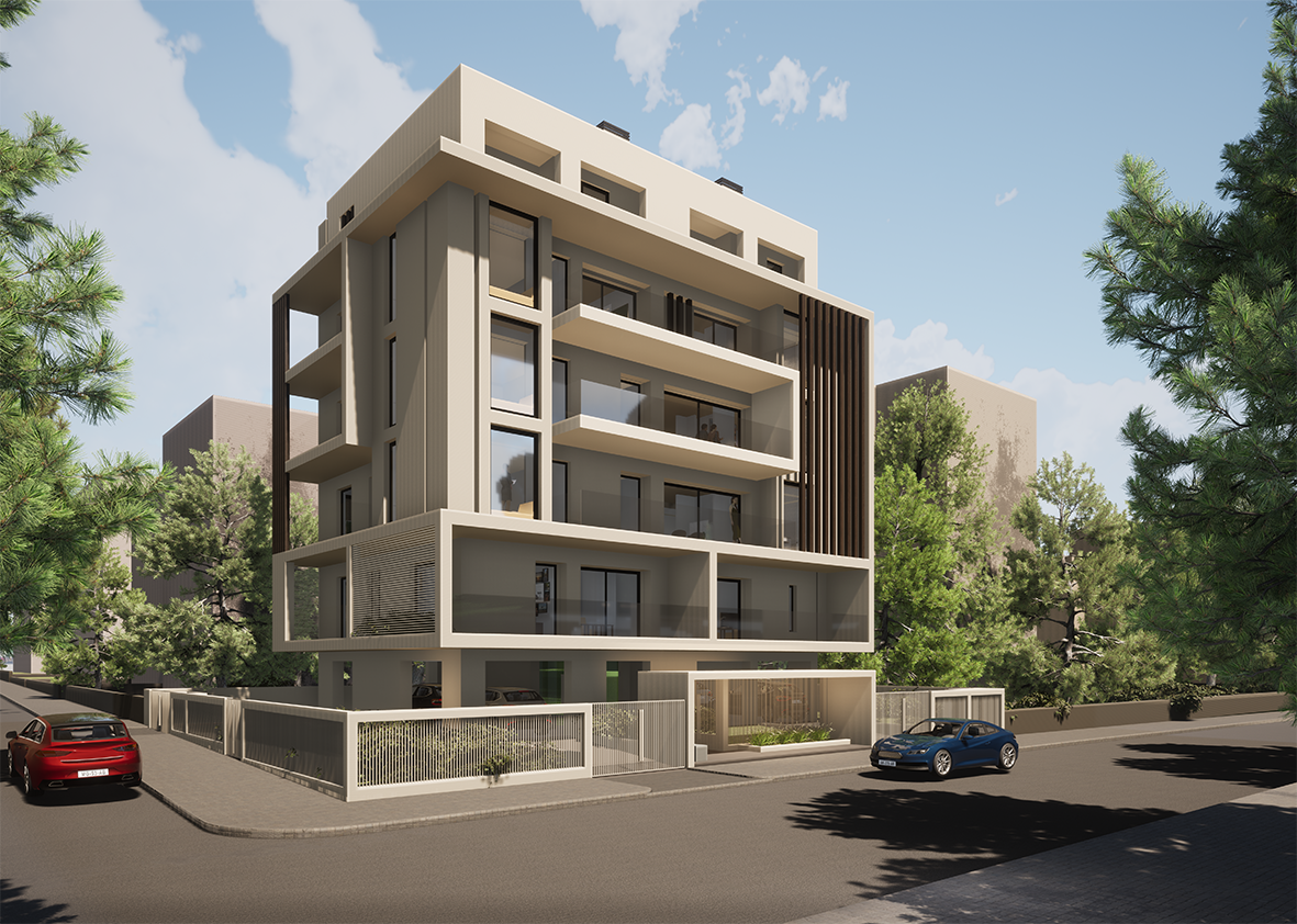 a modern architectural apartment building with a sleek white facade and elegant brown accents the exterior features large glass windows and minimalist balconies surrounding the building are lush green trees adding natural beauty to the urban setting three cars in vibrant red and blue tones are parked nearby enhancing the lively atmosphere a clear blue sky with soft fluffy clouds provides a serene backdrop highlighting the building s contemporary design the overall scene conveys a peaceful and upscale residential ambiance