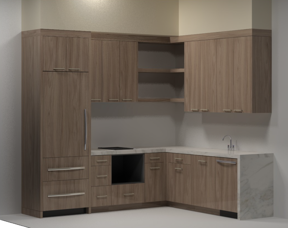 enhance rendering add decorations make wood floors add backsplash add microwave oven under cook top add decorations in floating shelves
