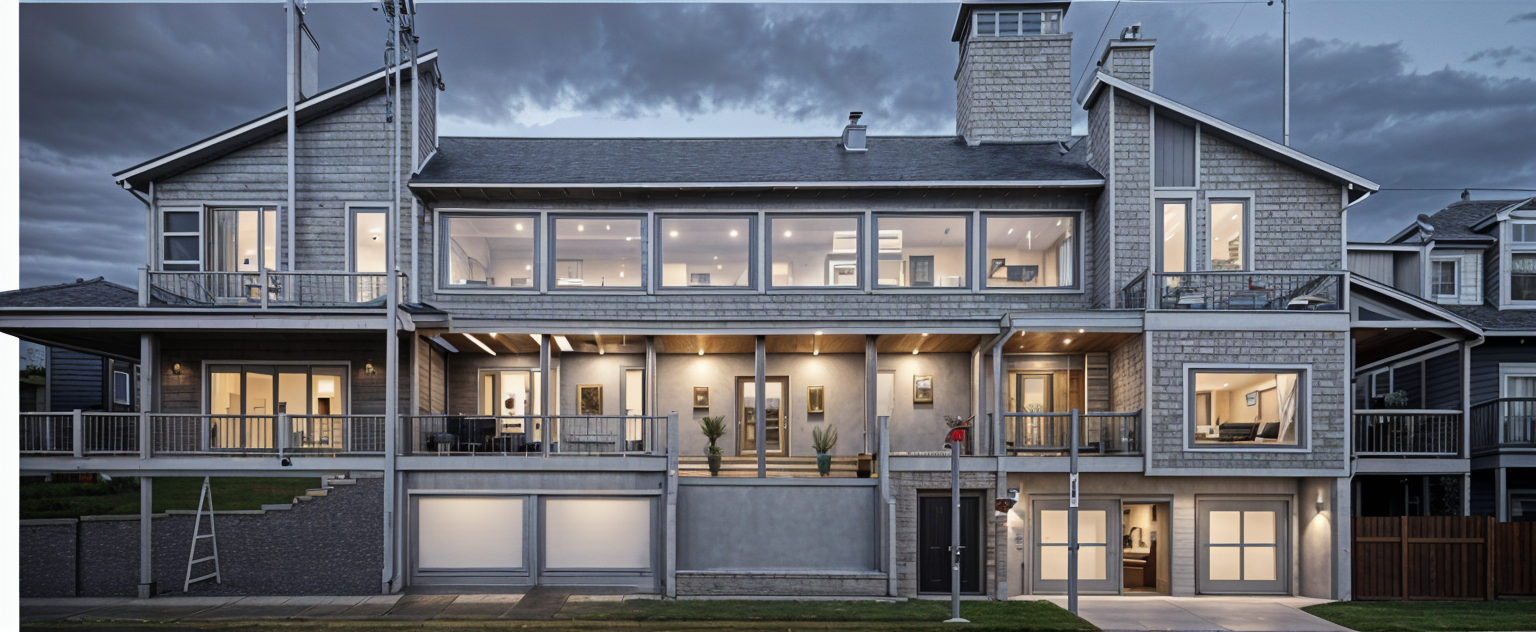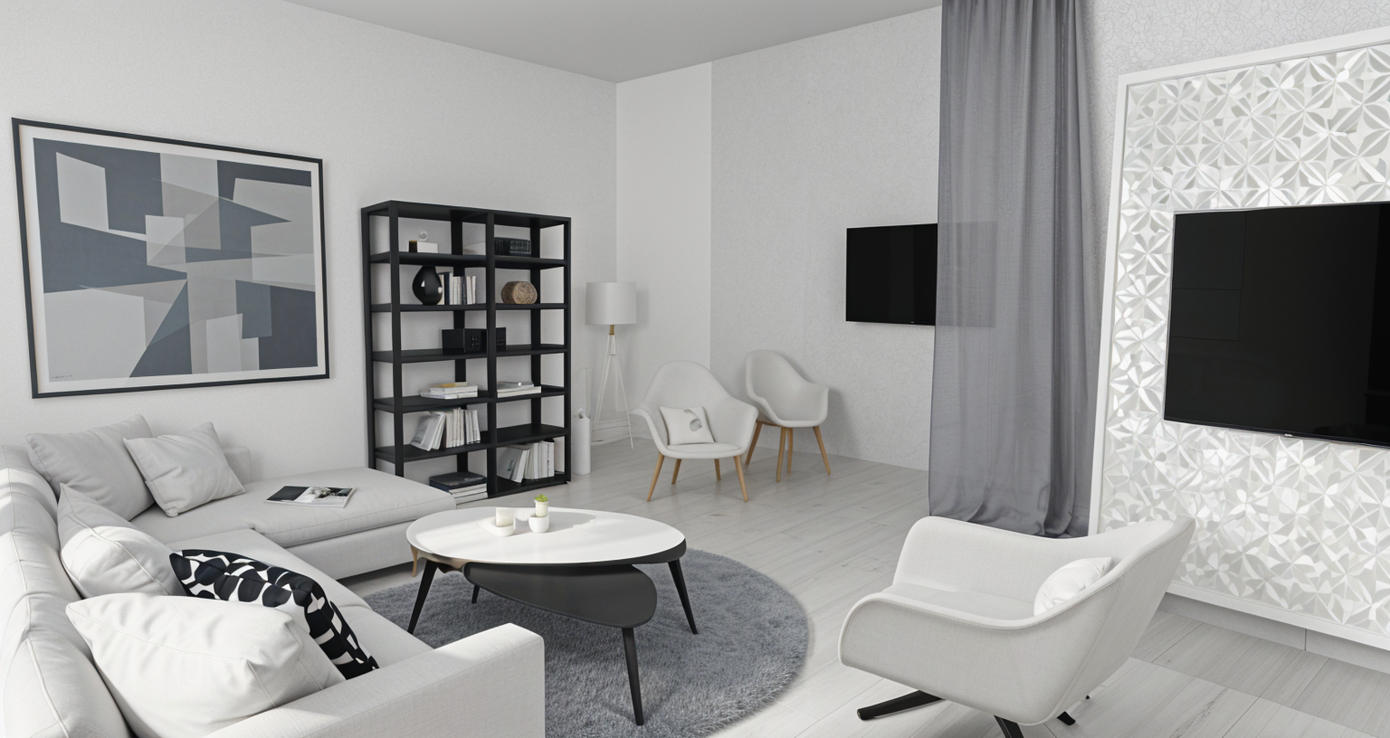 render a modern kitchen interior with a luxurious marble countertop featuring a white and gray marble texture the cabinets are sleek matte black contrasting with oak wood accents on the island and stools the backsplash is a matching marble pattern enhancing the elegant theme large industrial style windows framed in black allow daylight to illuminate the space casting soft shadows the pendant lights are spherical with a soft warm glow add a sophisticated brass faucet with a vase of delicate branches on the counter the atmosphere is minimalistic with a neutral color palette of white gray and natural wood tones emitting a peaceful and refined ambiance