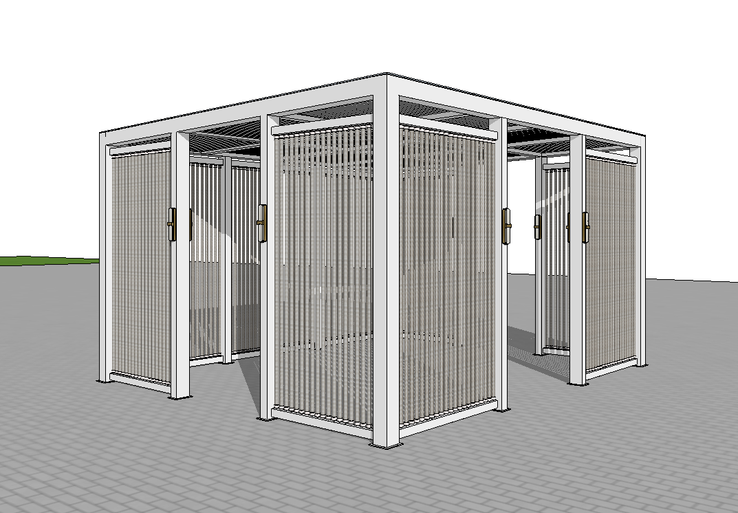 a photorealistic render of the exact pergola structure shown in the reference do not change or alter any geometry proportions spacing thicknesses or positions of elements all vertical rope louvers must remain exactly as modeled fully fixed non rotating tightly spaced with no gaps between cords the frame must stay pure white aluminum identical to the model the top structure and all beams remain unchanged produce bright sunny daytime lighting place the pergola in a luxury west palm beach resort environment elegant light stone paver flooring under the pergola lush green grass around tall palm trees behind soft shadows clean blue sky upscale hotel architecture visible in the distance absolutely no modifications to the object itself only upgrade materials lighting and the environment for high end photorealism