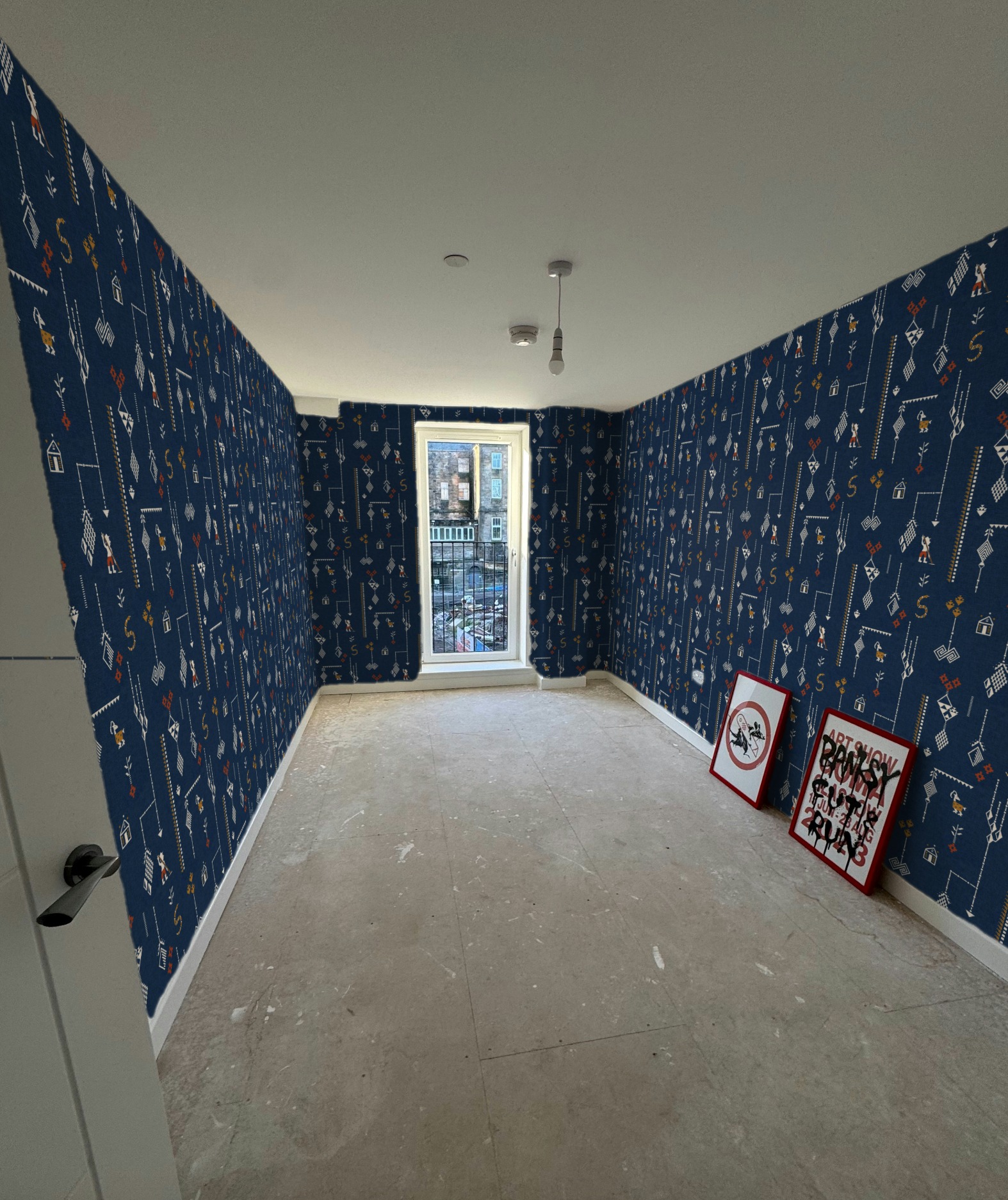 using this photo please add in a herringbone wood floor with a wooden double bed 4 poster contemporary with navy blue bedlinen and an ochre cushion