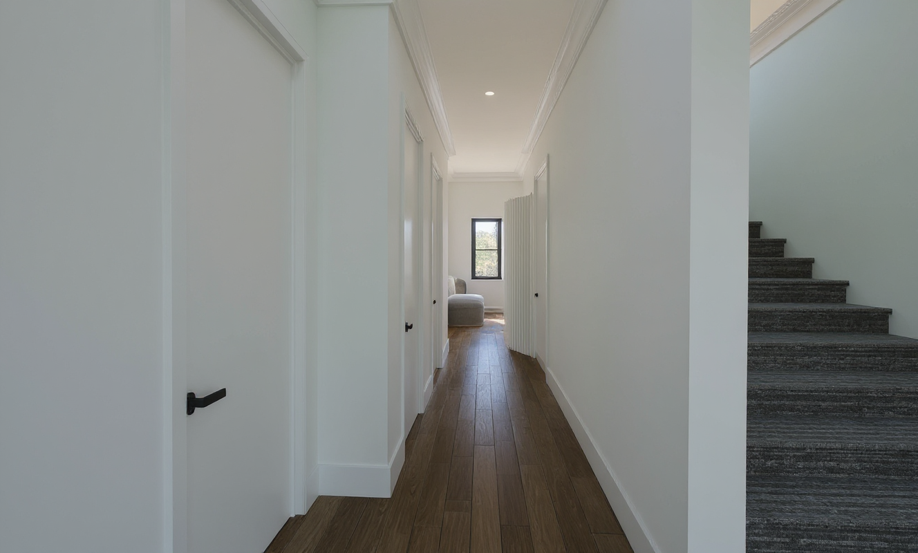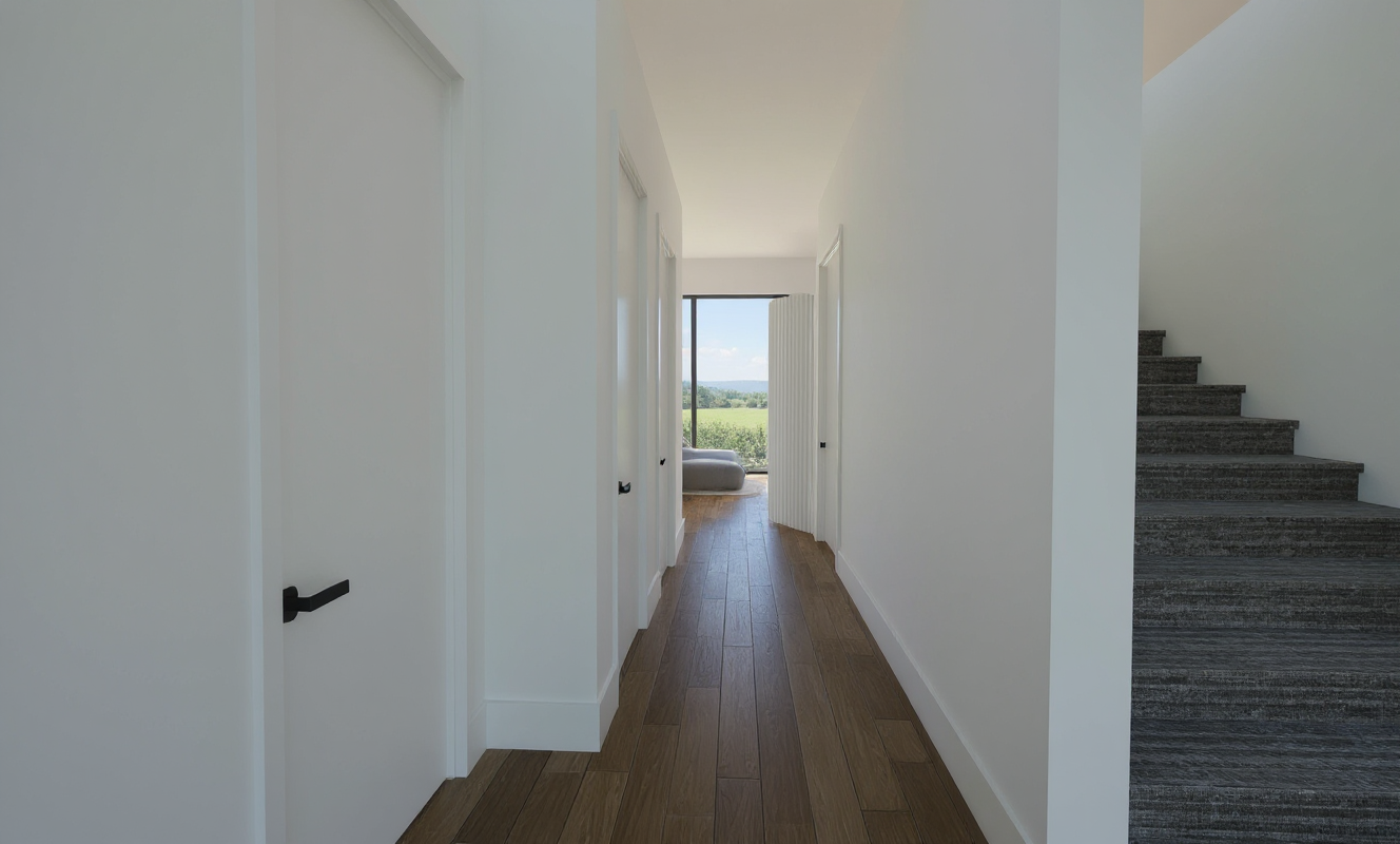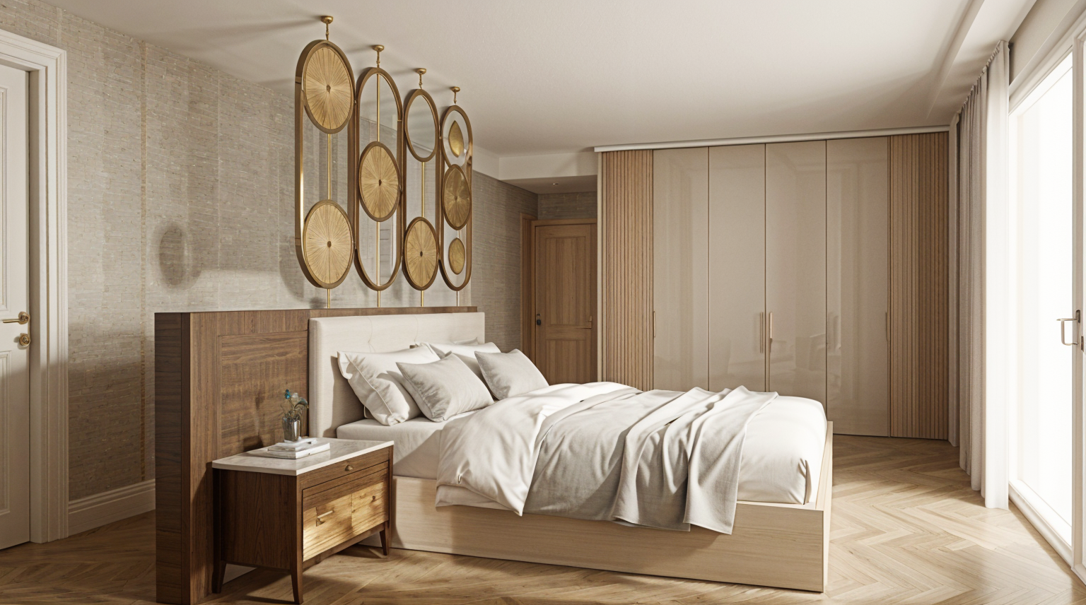 make it more realistic keep the colors the same have led lighting inside the nightstands make the doors a light color have bedding on the bed let daylight come from the window on the right have a walled panel with grooves next to the bed make all the doors the same light color make all the cabinet doors on the left of the bed the same light color with vertical grooves