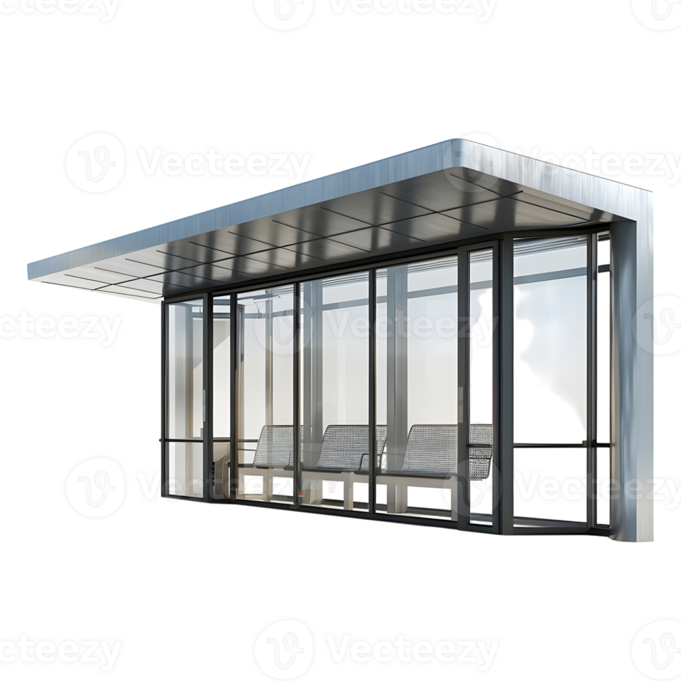 modernist exterior shot a minimalist waiting shed with seats remove plants around waiting shed make the roof curvilinear the main materials should be glass and wood the waiting shed should be on a grass turf architecture