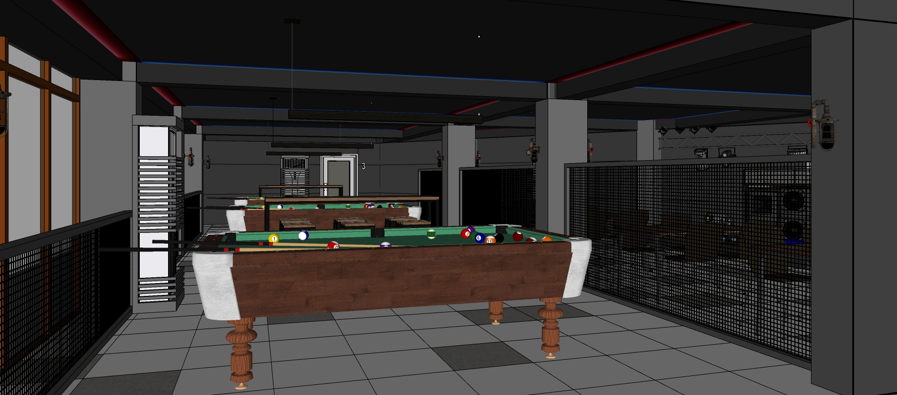 render a bar interior maintain the photo cove ceilings with led lights based on the picture industrial interior design