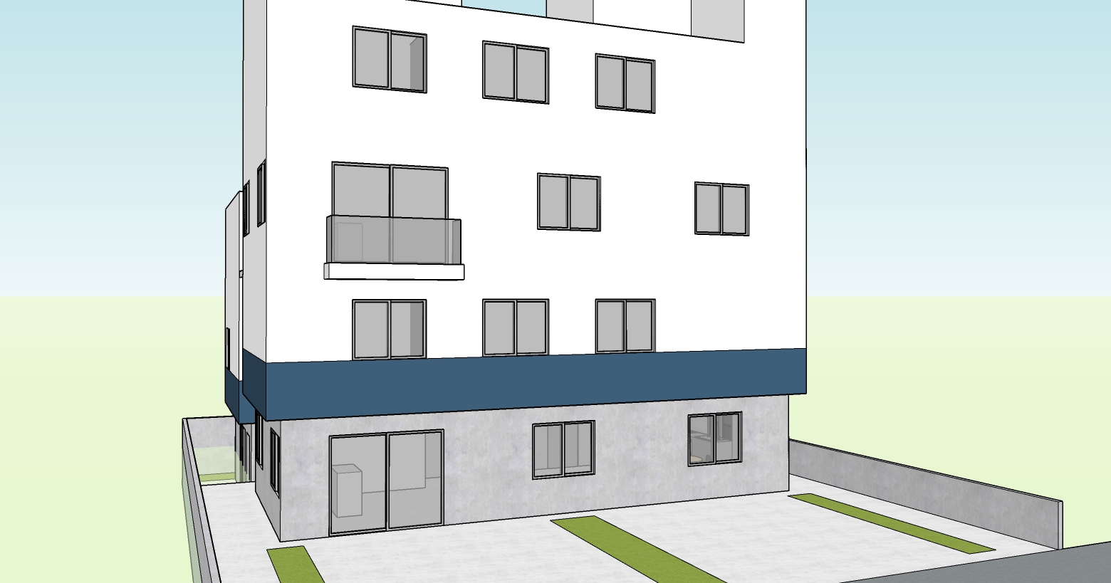 ultra realistic daytime exterior render keep exactly the same camera perspective framing and full image no cropping no design changes 4 story front building with two 3 story rear houses all with the same finishes white stucco with blue accents stucco must be smooth clean high quality with very light texture only only the ground floor uses gray brick veneer upper levels remain stucco perimeter wall board formed concrete modern gray concrete parking with three grass strips bright daylight blue sky with few realistic clouds soft shadows and realistic reflections balanced exposure right side small trees and palm trees low height dense vegetation left side realistic grass rear gray 2 story house with flat roof new clean high quality materials