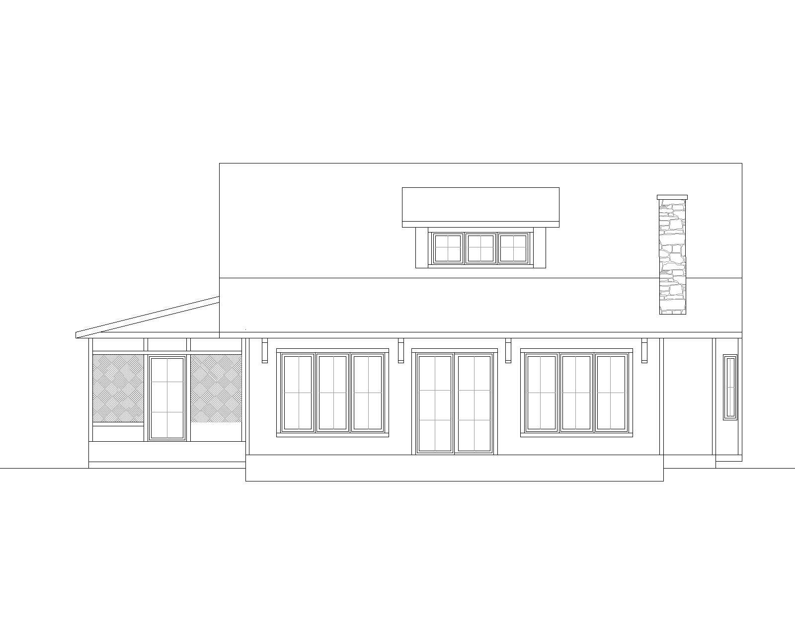 lodge style with mature trees cedar siding screened porch on left side black windows and black roof
