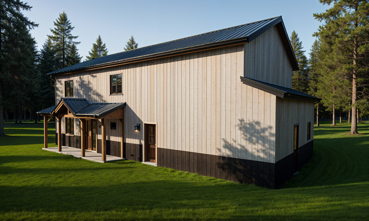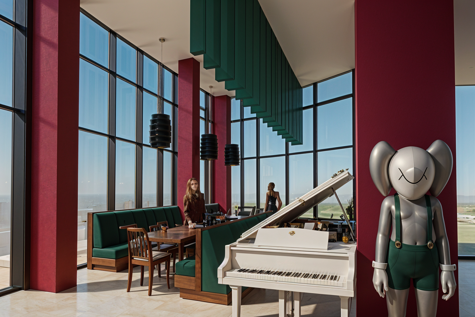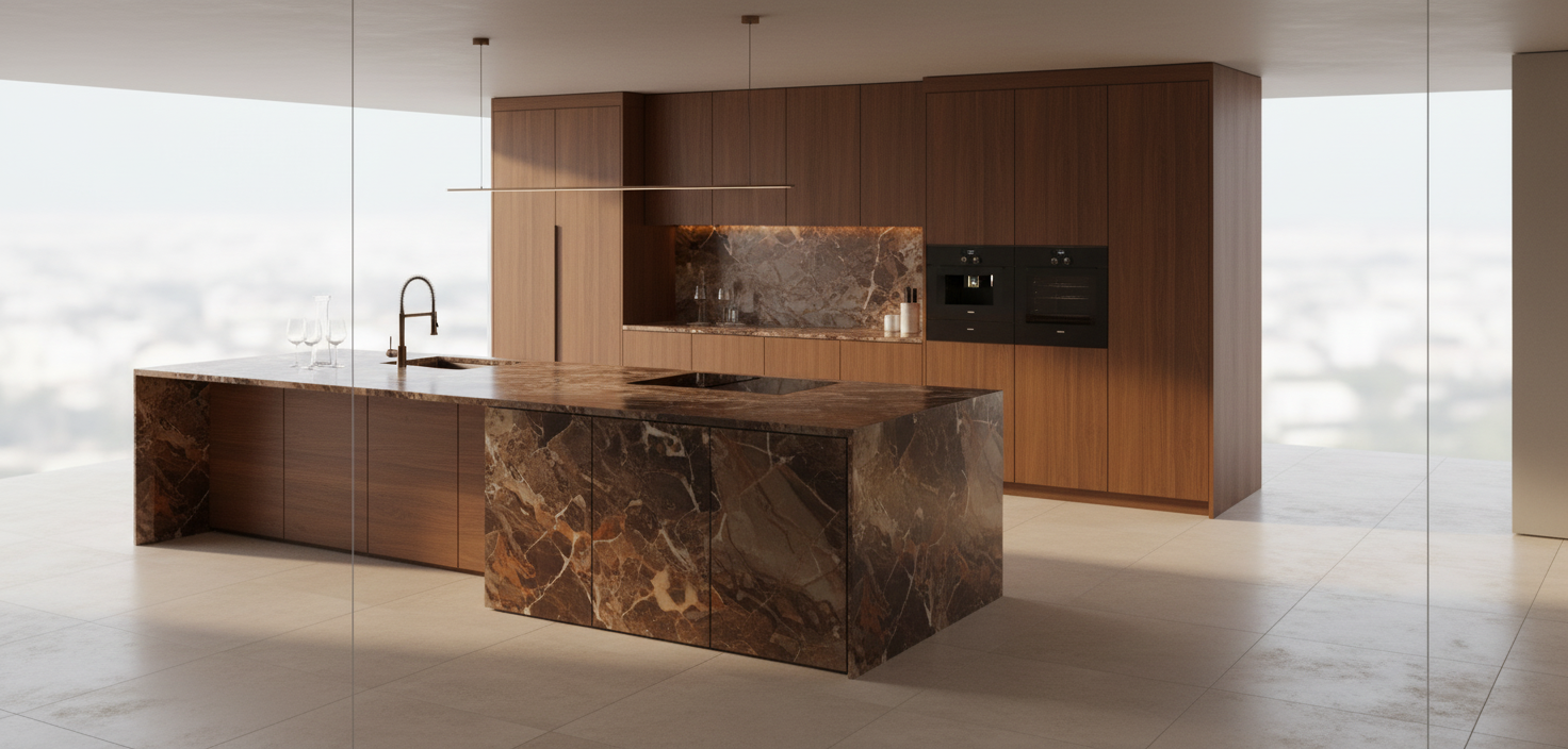 render a luxurious kitchen interior with a warm cozy and elegant atmosphere illuminate the scene with soft indirect lighting to create a sophisticated and intimate mood enhancing material richness and fine detail the floor is made of light colored stone tiles each 120 cm x 120 cm with a smooth matte surface that gently reflects light the countertop is made of emperador dark marble showing deep brown and orange tones with rounded flowing veins as is typical of this stone the marble must look polished deep and vibrant all wood elements including base cabinets from the island and hanging elements from the back composition are made from very dark brown wood with a calm and uniform grain to achieve a refined and timeless appearance in the back composition make the standing base cabinets and all non hanging units completely uniform in a warm brown tone with a smooth elegant surface and no visible grain use smoked oak only for the hanging cabinets above the central gap and for the kitchen island creating a strong connection between these elements the back panel of the back composition must be made of stone harmonizing with the emperador dark marble on the island place the sink on the left and the cooking station on the right add a sleek integrated tap in brushed bronze or gunmetal above the island install a thin linear hanging lamp 3 meters long emitting a warm soft light that enhances the cozy atmosphere behind the viewer include large windows that bring in natural daylight and open a view to the outside adding depth to the scene decorate tastefully with wine glasses carafes and subtle elegant accessories use realistic materials warm lighting and soft reflections to emphasize craftsmanship texture and depth ignore the two vertical lines in the front architecture