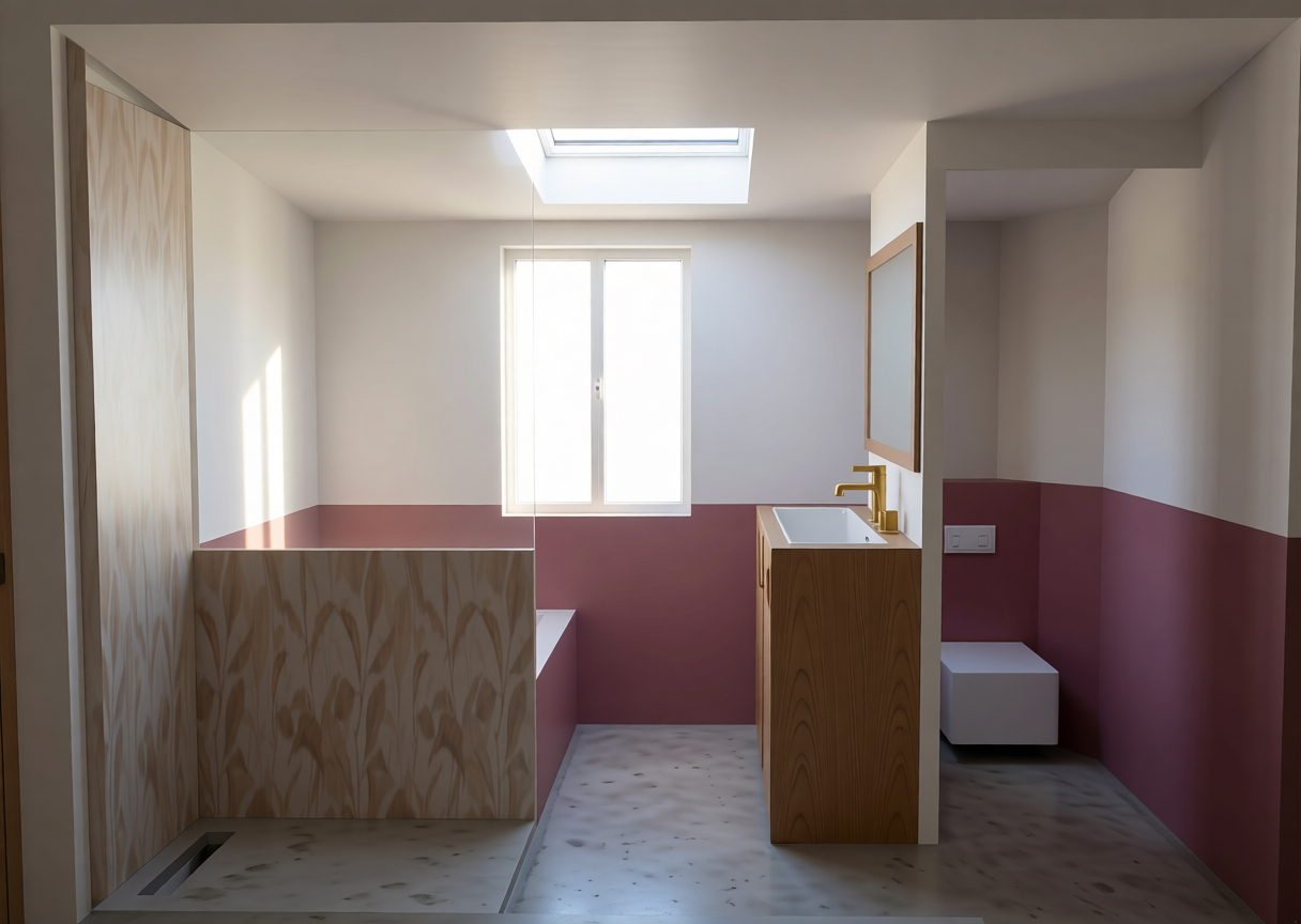 this house has a window front door with a window on the side the sheeting is charcoal chromodeck roof sheeitng the ground floor wall finish is rendered plaster work the external walls of the loft in the roof cavity is white weatherboard it has a double and single sectional white garage door please add a paved brick paving in front of the garage the garage pop out box is build grey colour facebrick please add a car in the driveway the house house has white window frames and triming