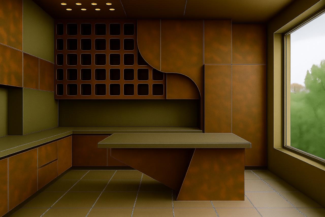 modernist exterior shot a 3d rendered digital image of a modern mid century inspired kitchen with a single wall layout the kitchen features corten steel cabinetry with a warm rust tone minimalistic flat panel design and no visible handles add refrigerator a geometric island with a sculptural triangular base and a built in black sink sits in the left side the backsplash is a matte taupe color blending with the countertops on the left wall there s a large hanging green fern adding a natural element to the right a floor to ceiling window allows soft natural light to enter showcasing trees outside the floor is tiled in large beige ceramic tiles and recessed ceiling lights provide additional warm lighting the overall aesthetic is clean symmetrical and serene combining natural textures with modernist shapes architecture