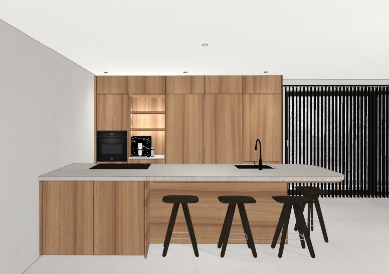 add decor to this light wallnut kitchen with matt travertine worktop