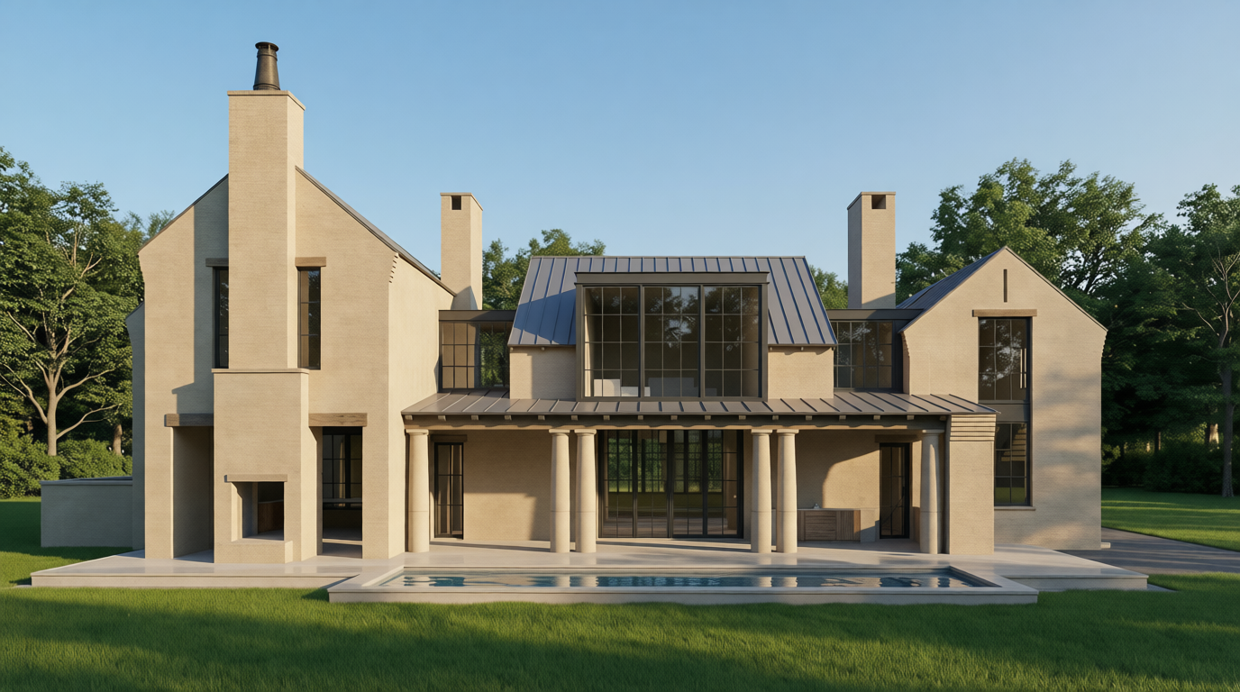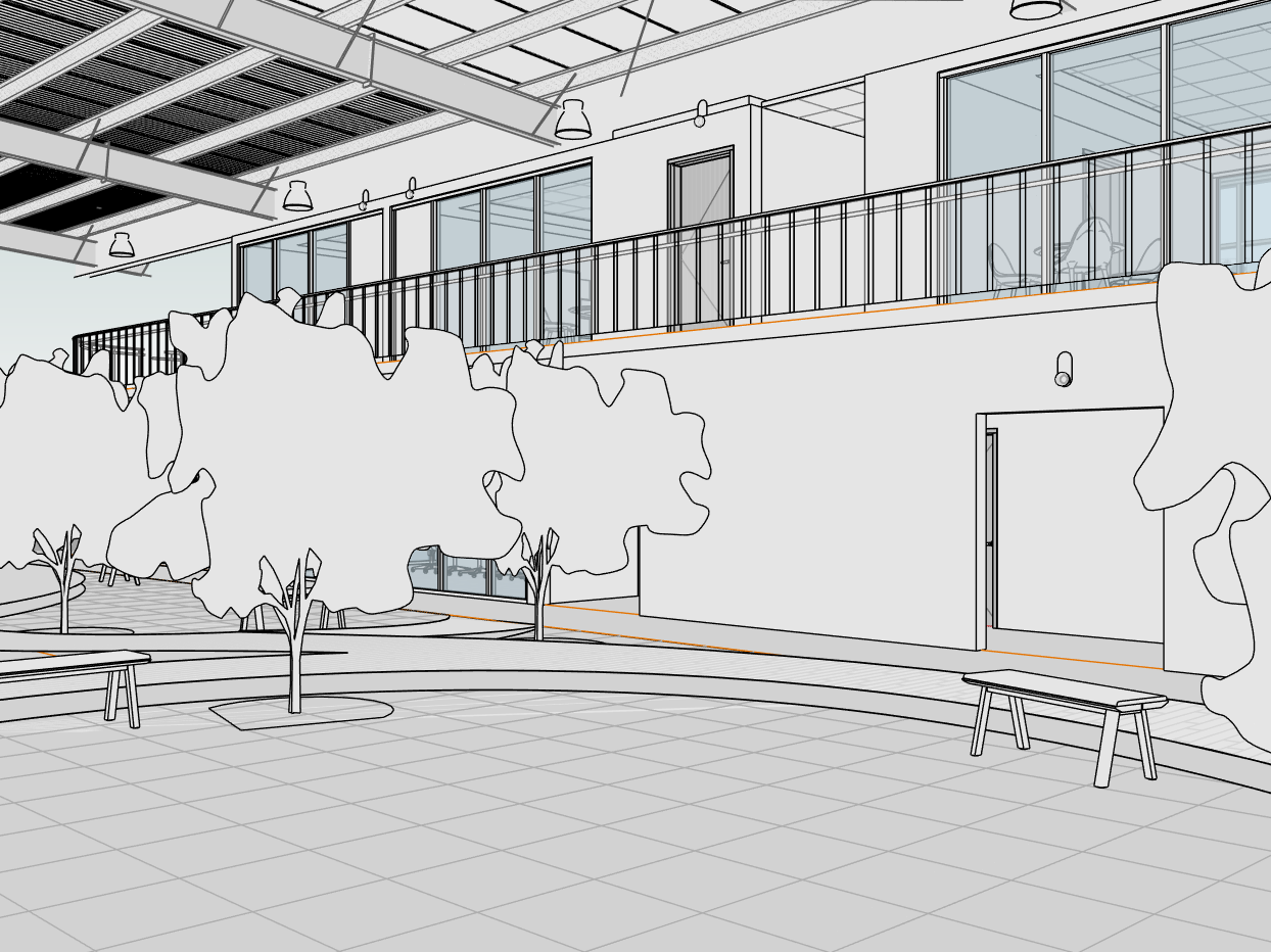 make this look like an office space with landscaping and a boardwalk in the middle of the space