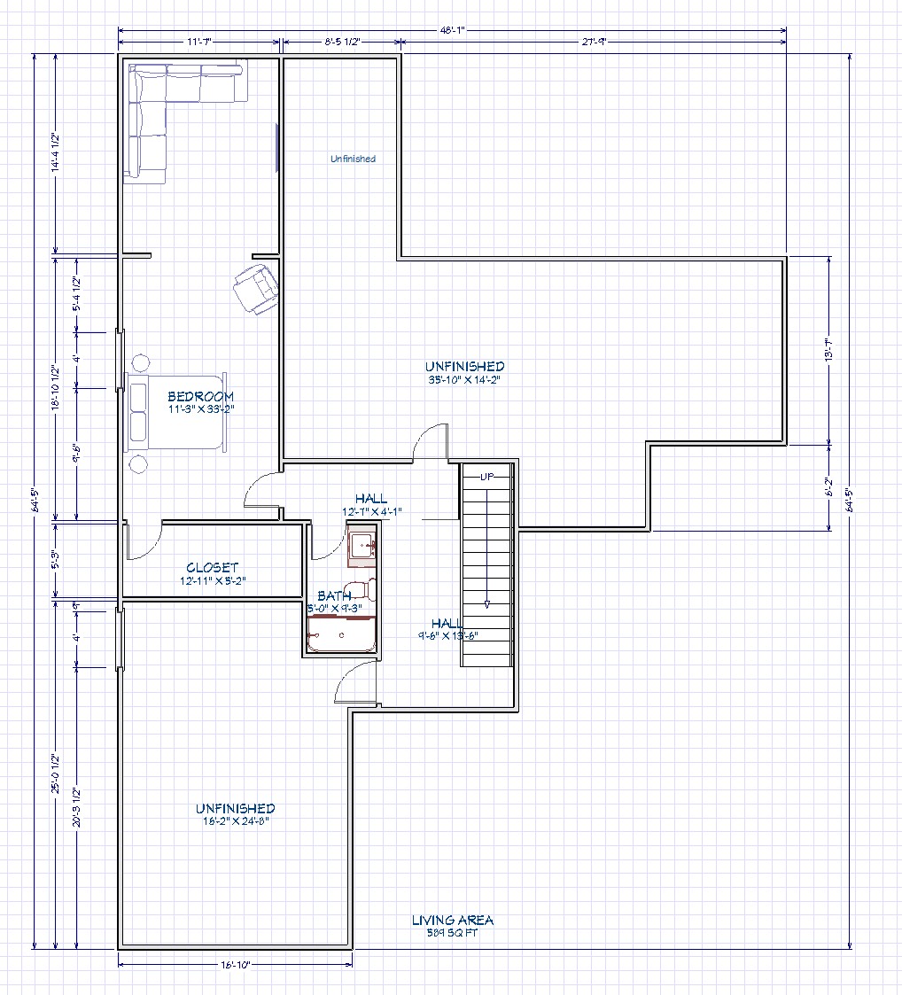convert this floor plan into a realistic isometric 3d view of a full house show the space from an elevated angle with furniture walls and details visible there are two large rooms labelled unfinished keep those unfinished and show concrete floors and studs the bedroom is also living room are one great room include furniture do carpet flooring everywhere in the closet and bedroom and living area and then tile in bathroom with a shower use the same furniture as shows on the plan do not change the orientation of the floorplan