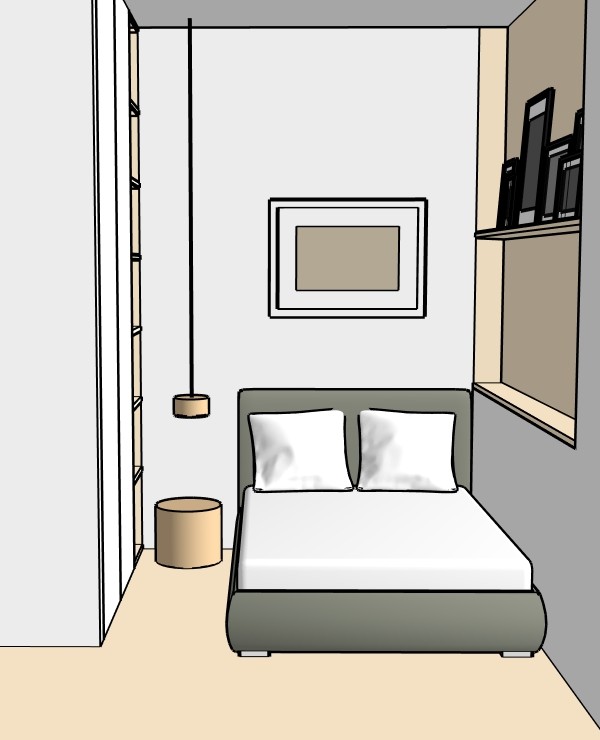 render this bedroom taking into consideration the pendant light on one side and the french oak parquet make it a cozy atmosphere and add a rug under the bed the beige color in the image should appear as french oak wood in the render and the white color should appear as a subtle light grey taupe don t change the geometry of the room at all you can only change the pendant light and the side table s shape