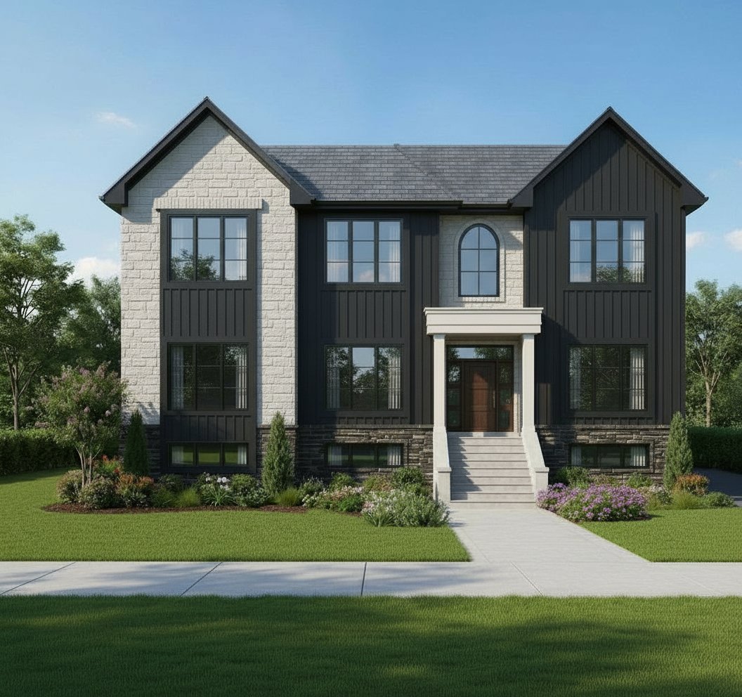 exterior shot add modern farmhouse style metal window awning on the bottom left window in black the window above the door change it to a small oval one at least 50 smaller than current size the front entrance change it to a modern transitional style entrance with a metal awning architecture