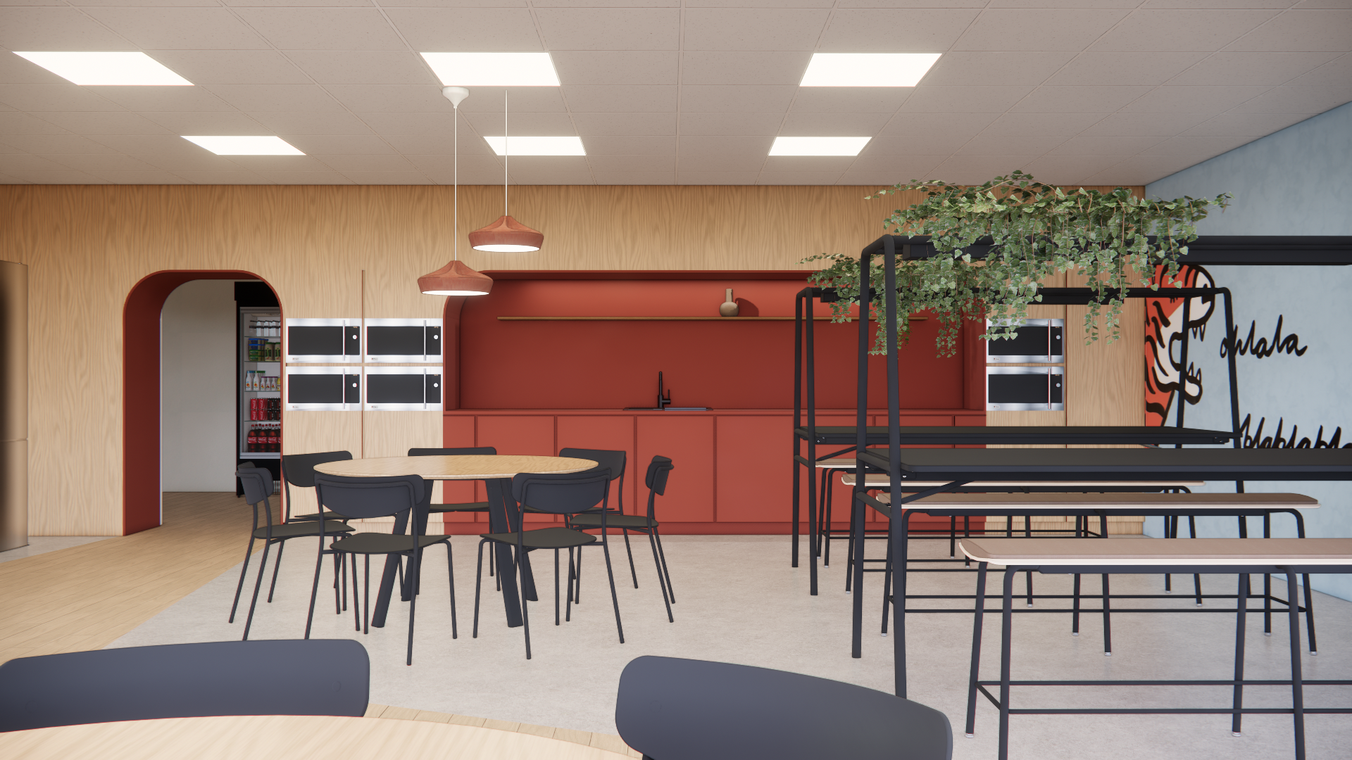 modern cafe interior featuring a minimalist design the atmosphere is cozy and inviting emphasize light wood textures on the walls and tables in soft natural tones highlight the striking red cabinetry and accents throughout black chairs and table legs provide contrast adding to the sleek contemporary feel include hanging plants with lush green foliage for a touch of nature the ceiling is adorned with warm white lighting enhancing the overall ambiance a mural on the blue gray wall adds artistic flair