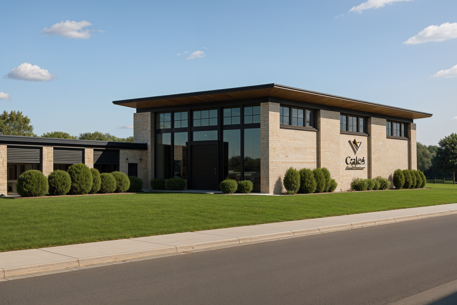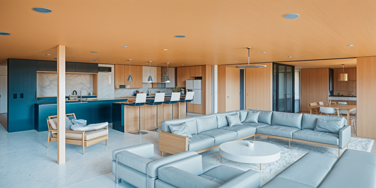 minimalism exterior shot render a modern architectural structure with a minimalist design the walls are in a muted gray with sleek vertical slats the roof is flat and dark complementing the gray walls set against a clear blue sky the lighting is soft and natural creating gentle shadows the surrounding atmosphere is calm and serene with a subtle gradient transitioning from sky blue at the top to a soft pastel near the horizon evoking a peaceful morning or late afternoon ambiance architecture
