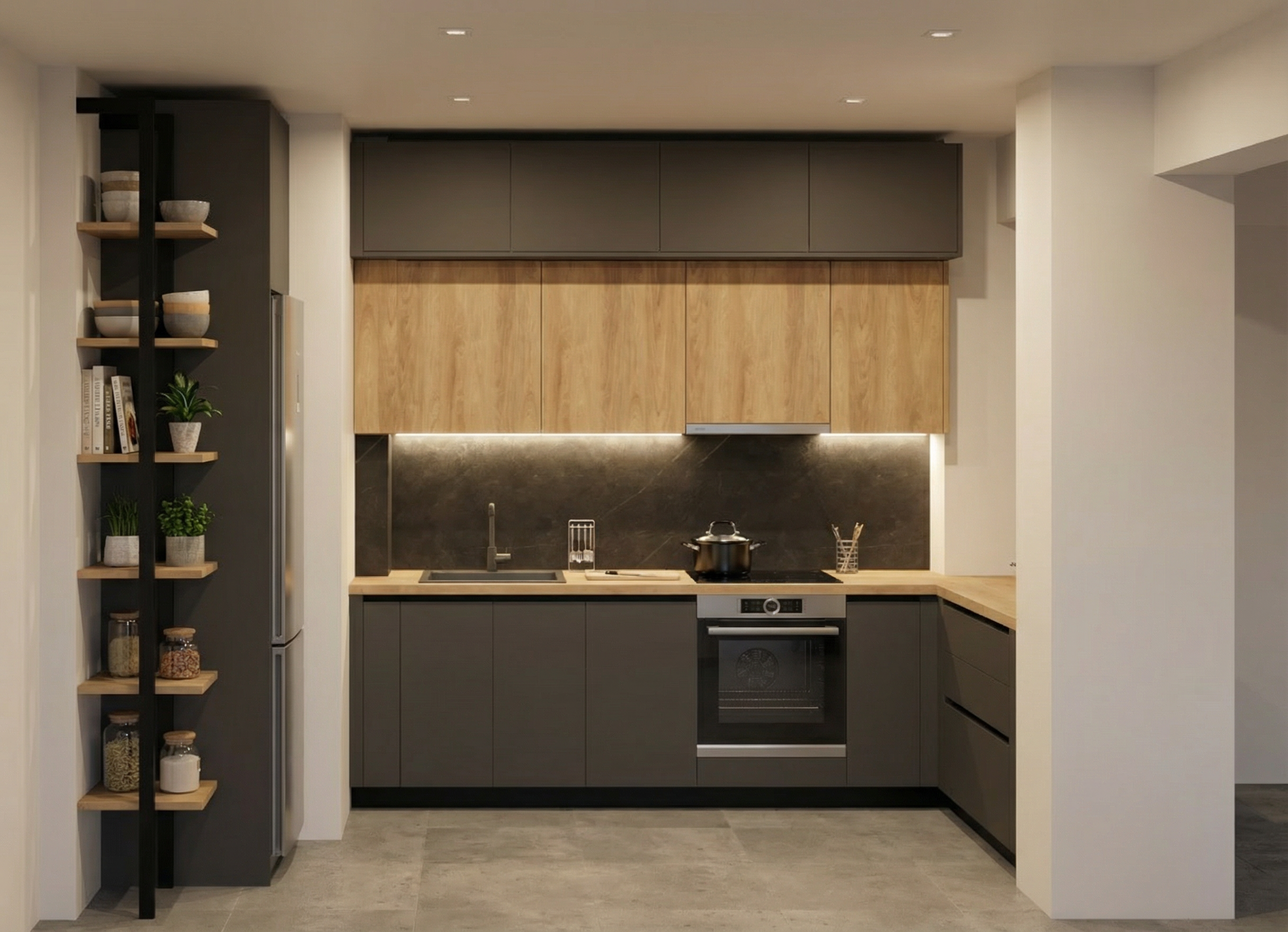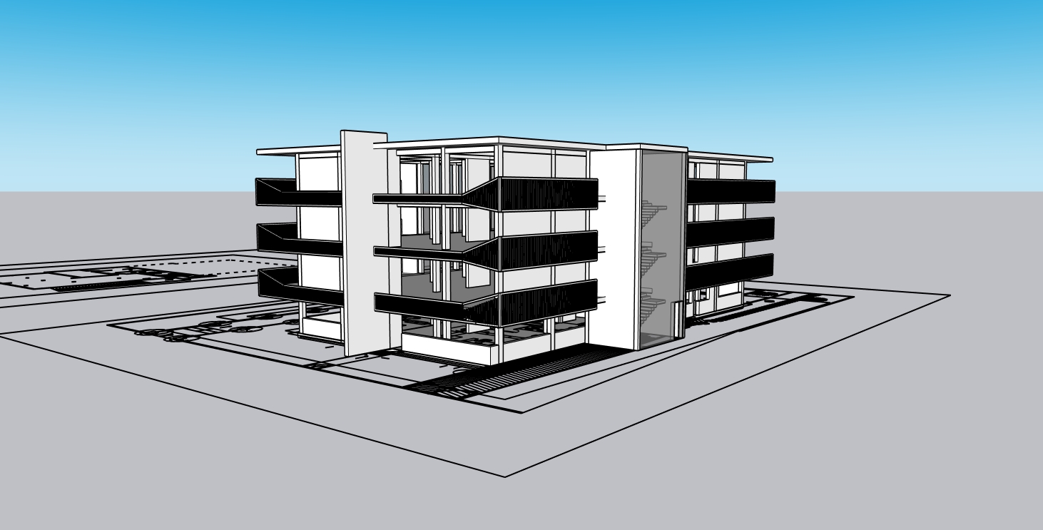 modern rectilinear apartment building with straight floor slabs continuous wavy balcony parapet wrapping around corners smooth flowing top edge only consistent sinusoidal curve across all floors clean white facade with dark balcony bands minimal structure elegant and restrained wave expression photorealistic