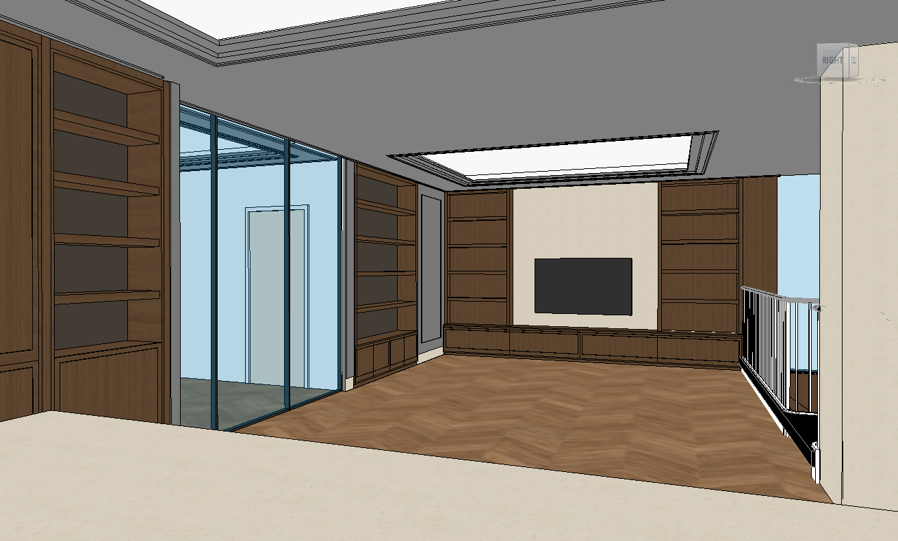 transform the provided living room image into a high end photorealistic render that matches the exact same design language materials and lighting approach as the adjoining kitchen this room is directly opposite the kitchen keep the design exactly the same with absolutely no changes to geometry proportions or object positions all wall layouts joinery shelving sizes glazing positions ceiling shapes and recesses skylight coffer forms floor pattern balustrade and tv wall composition must remain unchanged with nothing moved added removed or resized set the scene in a bright sunny daytime mood with strong natural sunlight entering primarily through the glazed partition on the left producing realistic sun patches and soft directional shadows across the herringbone floor and joinery maintain a clean calm luxury residential feel that is detailed but not cluttered all timber joinery must be rendered as a light contemporary matt walnut with refined grain and crisp panel edges matching the kitchen s timber tone and finish any painted elements in the room should follow the same deep muted gun metal blue used in the kitchen where applicable while retaining timber edge accents exactly as indicated by the model the recessed dropped ceiling must retain its exact form and use only indirect lighting concealed within the ceiling recesses emitting a soft supportive glow that complements daylight remove any direct downlights or visible direct fixtures the tv wall must remain exactly as designed with enhanced material realism subtle fabric or plaster texture to the central panel if present refined shadow gaps and accurate reflections on the screen populate the open shelving with neatly arranged books and a small number of restrained high end decorative items to make the space feel lived in and cohesive with the kitchen styling while keeping the room clean and organised enhance realism throughout with physically accurate daylight soft shadow gradients detailed wood grain precise glass reflections in the partition and natural variation in materials without altering the design