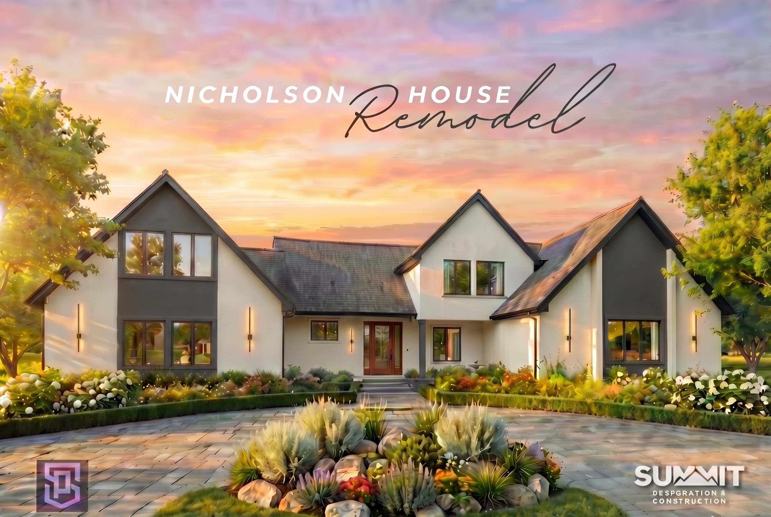 paint the dark stucco to warm stone by sherwin williams change the front door pillar to wood match the front door color do not add anything else do not change or add to the structure leave all windows doors and framing alone