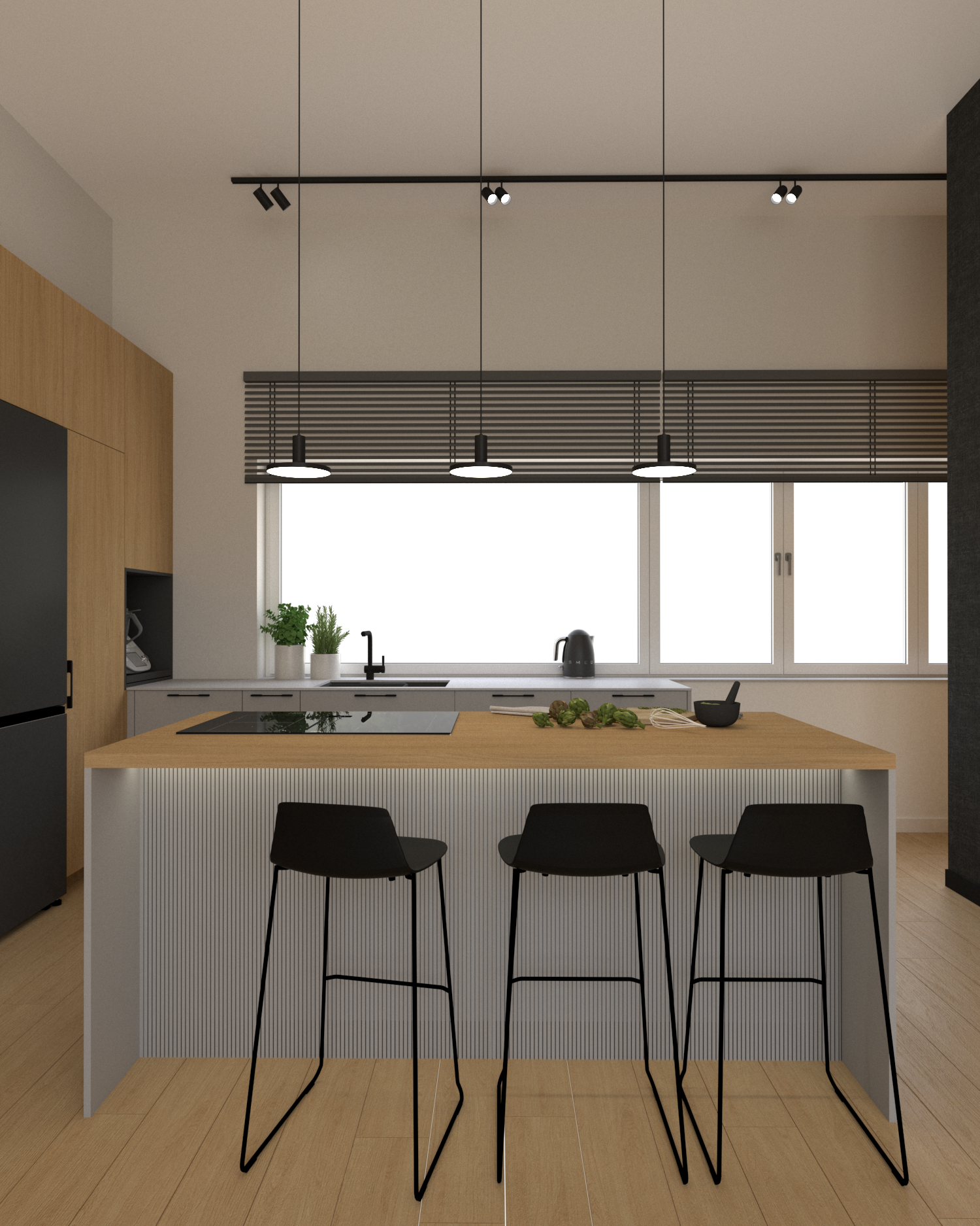 wizualizacja bardziej realistyczna nie zmieniaj element w wyposa enia blat wyspy pozostaje drewniany boki wyspy szare pod blatem ryfle