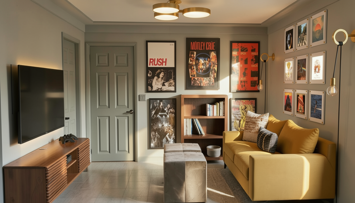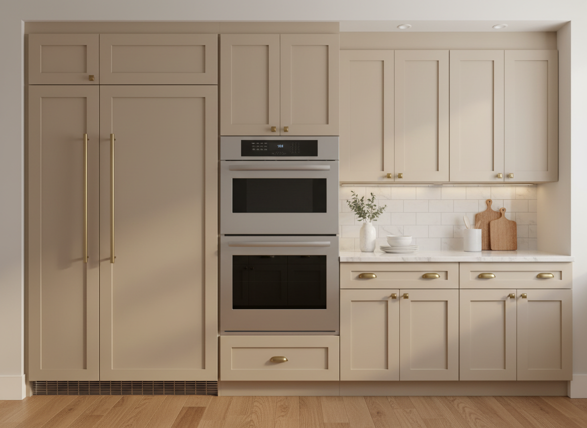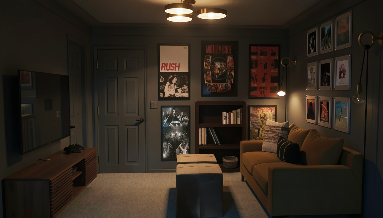 partly cloudy day some deciduous trees behind the house water is reflected in glass windows 2 chairs and a side table on the porch gray siding white trim white windows add landscaping