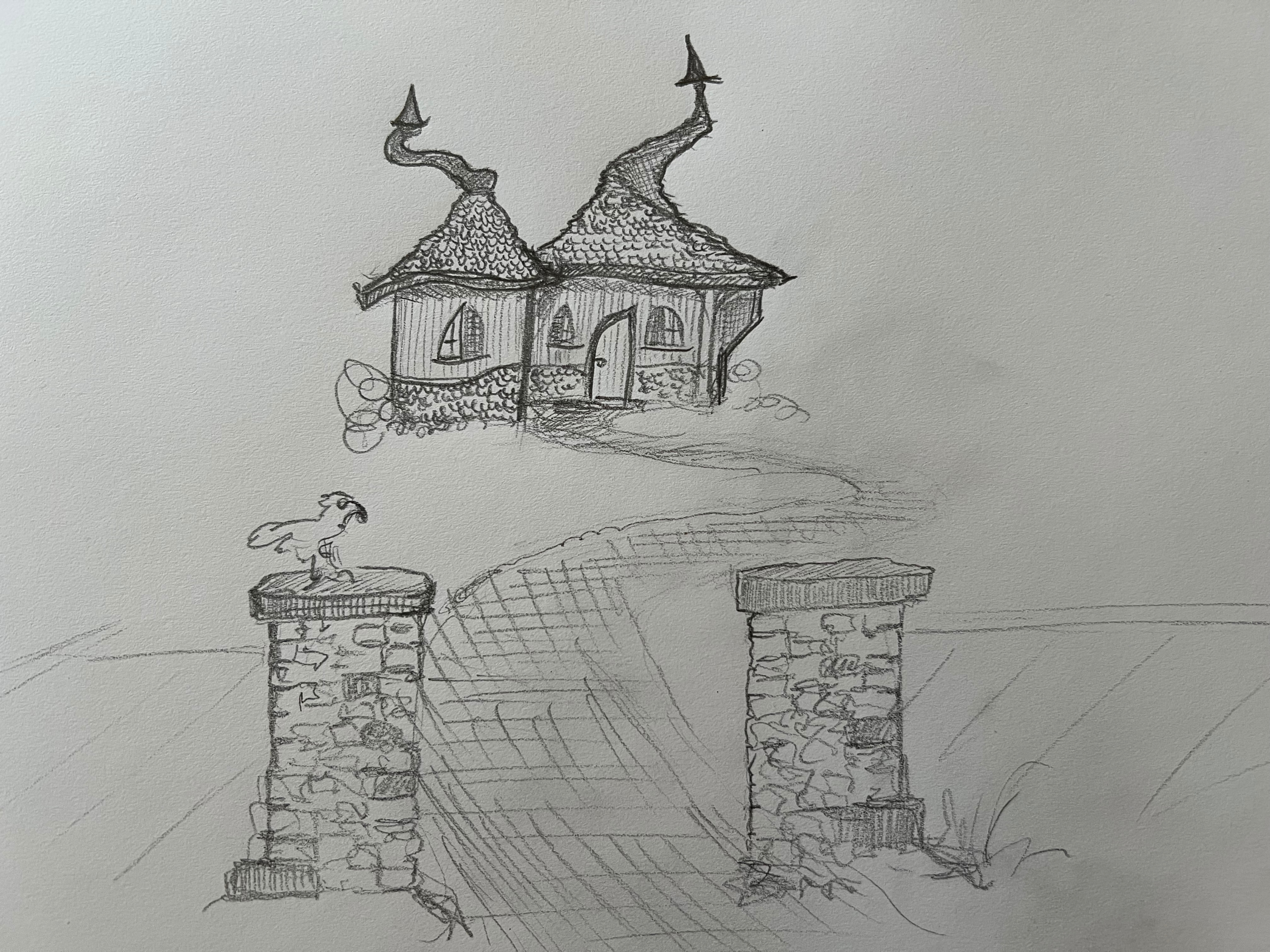 exterior shot transform the sketch into an architectural ready image of a fairytale like which s cottage with roof that has the shape of a hat and wooden walls with wood chipping decoration let the door have wood carvings and wrought iron details