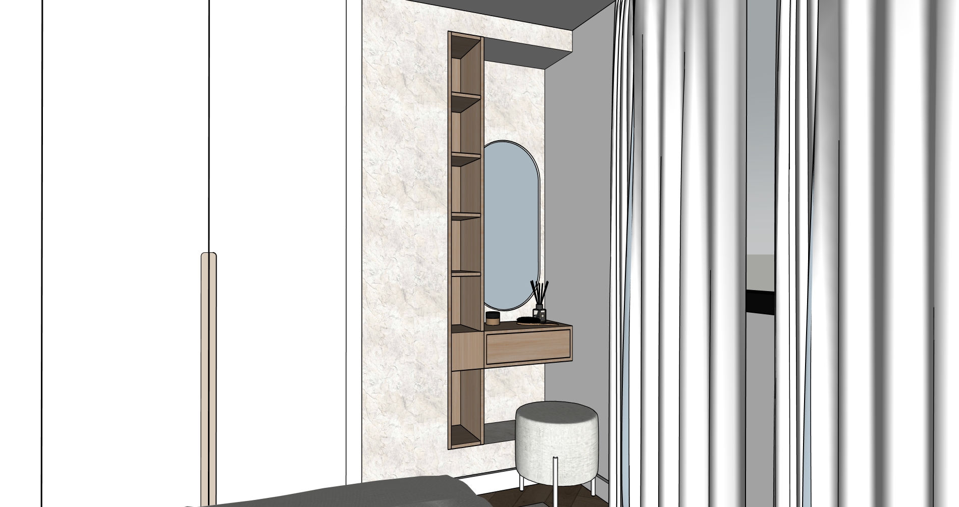 crea una imagen fotorealista a partir de este sketchup realza texturas e iluminacion a ade algo de decoracion en la estanteria quita las plantas solo deco quita la planta