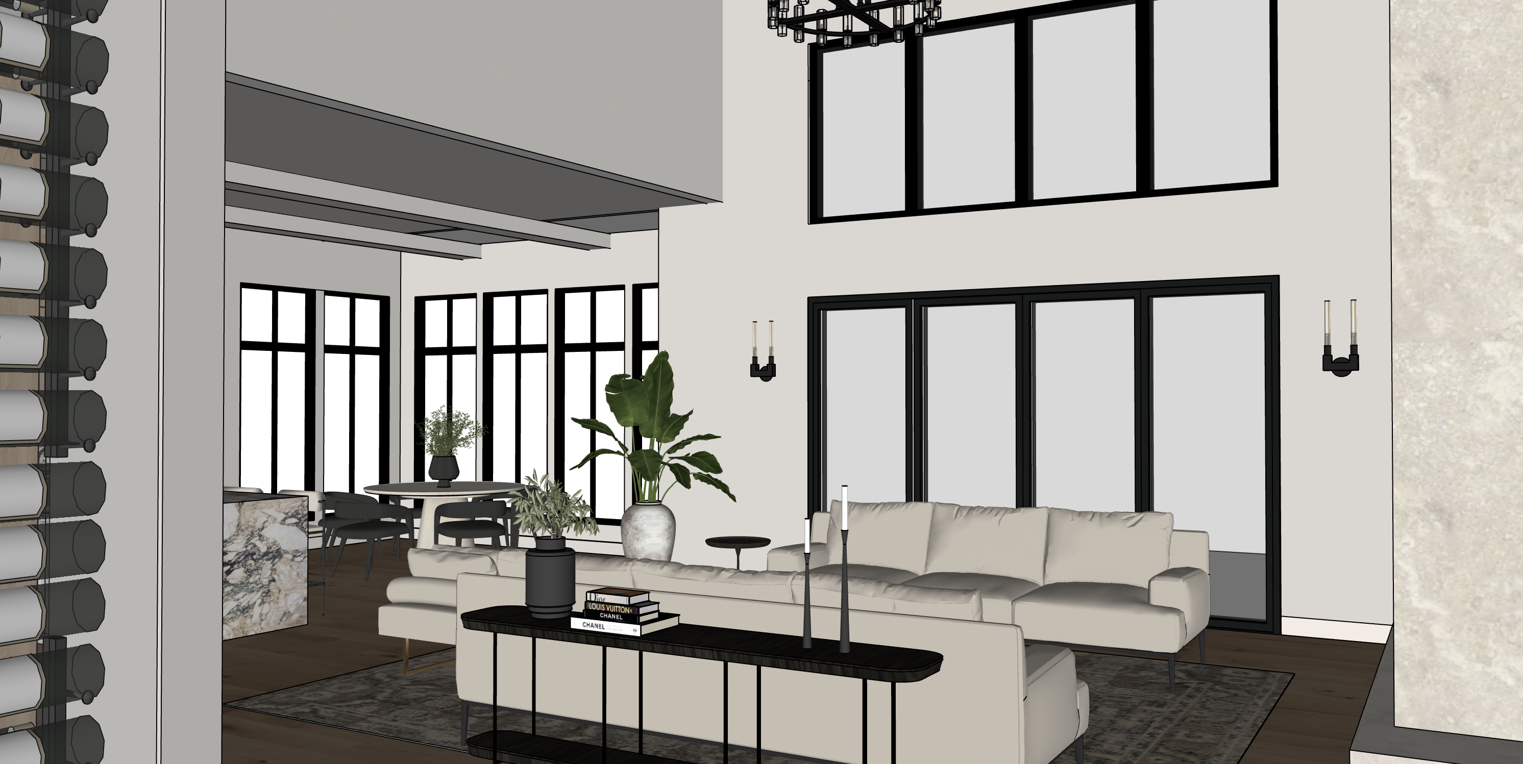 lighter white oak wood windows look out at lounge area landscaped back yard