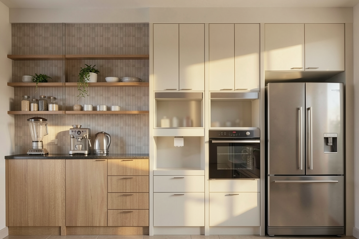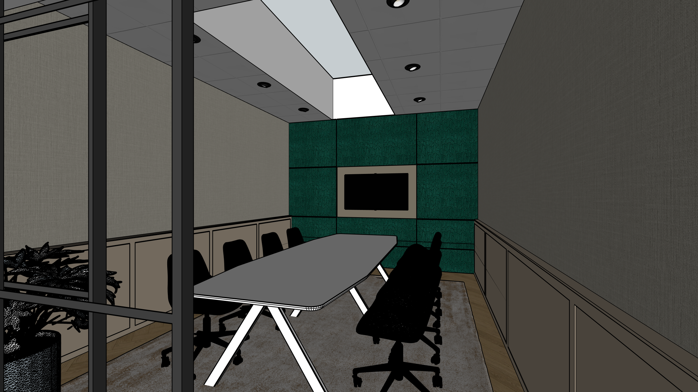 photorealistic interior render of a professional office space architectural photography style inviting warm atmosphere fixed elements walls back wall dark green velvet acoustic paneling rich fabric texture soft light absorption side walls left and right vescom lynn textile wallcovering subtle refined texture wainscoting classic wooden lambrisering with a rectangular panel layout straight corners featuring rounded molding profiles soft curved trim ridges elegant craftsmanship ceiling recessed spotlights with a black fixture finish furniture decor large central meeting table with a white solid surface tabletop smooth matte finish chairs midj dalia office chairs surrounding the table upholstered modern design carpet indivipro lagos 05 underneath the table plush high quality pile texture neutral tones television screen mounted on the wall with a brushed bronze frame feature lighting metallux libra pendant lamp hanging above the table warm illumination a second metallux libra pendant lamp positioned directly under the glass skylight lichtstraat environment lighting soft warm natural daylight streaming through the glass skylight lichtstraat and large windows the light creates a gentle golden glow in the space without any overexposure or harsh highlights perfectly balanced exposure balanced global illumination realistic soft shadows 8k resolution highly detailed materials depth of field