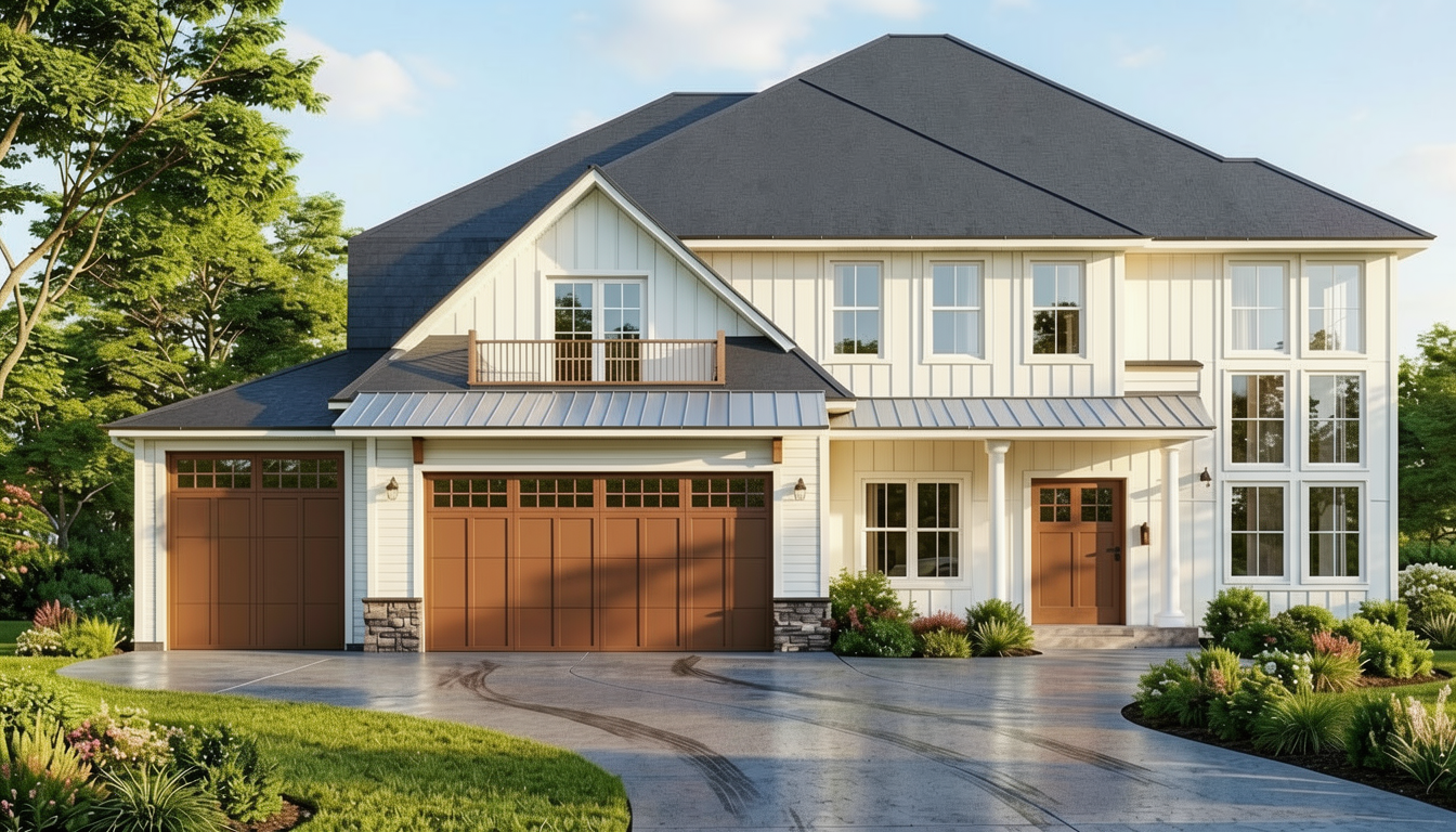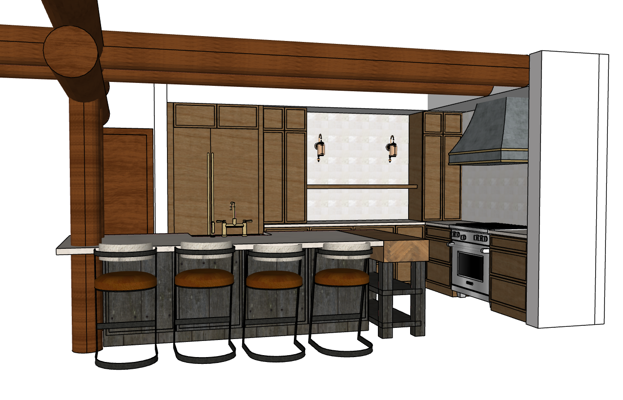 add dark wood floors rustic logs dark grey blue kitchen island cabinetry backsplash walls to be zellige tile butcher block at end of island