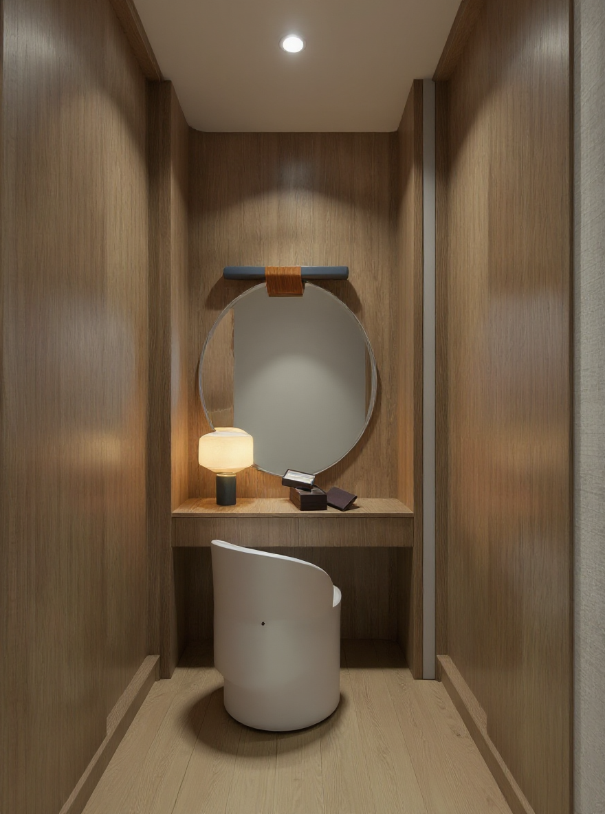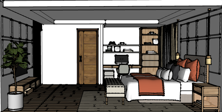 a bedroom in a morning lighting do not change any structure furniture just show texture and cove lighting on ceiling wood flooring in warm wood a cozy feel bedroom walls are in white with wood panels all white