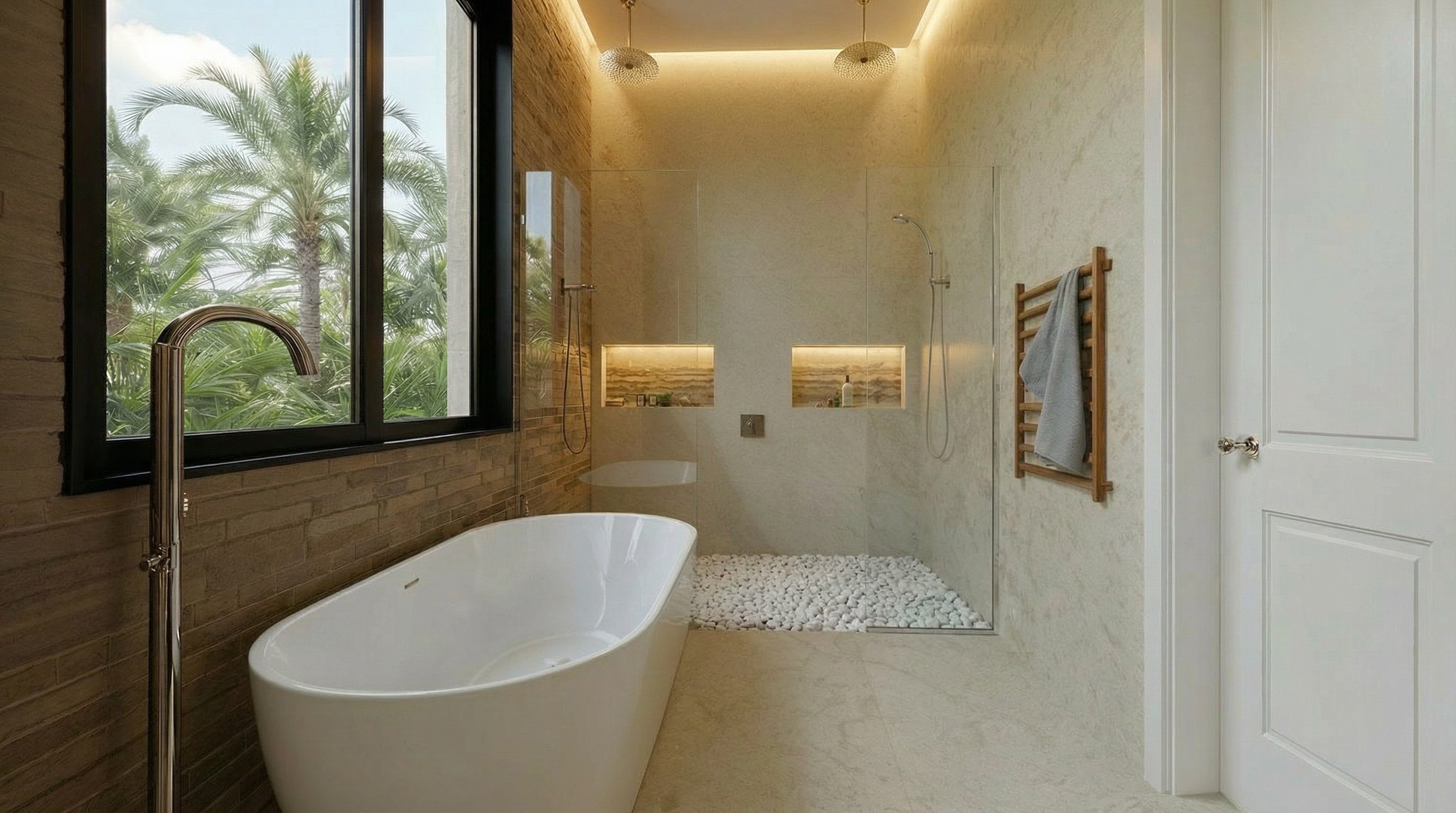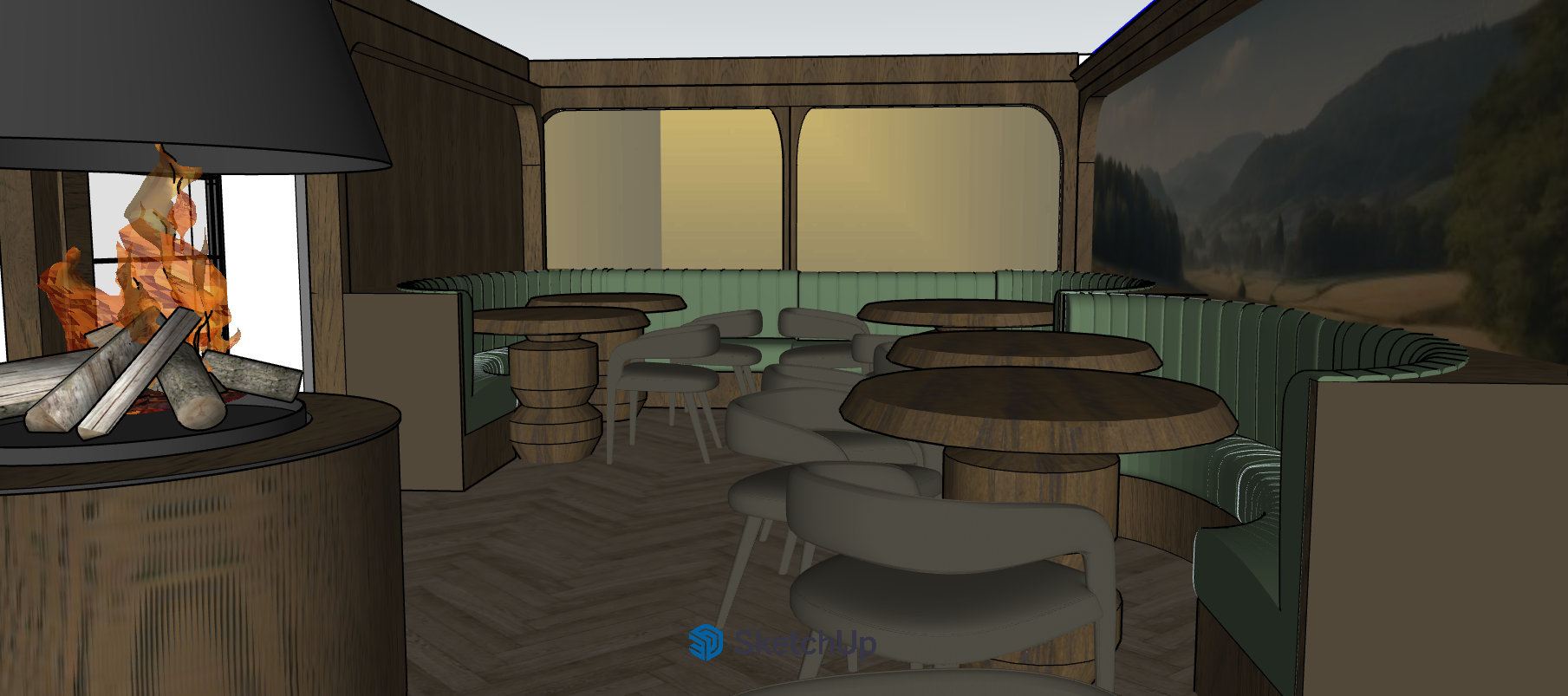 a luxurious modern restaurant interior with a deeply atmospheric cinematic warmth tall dark wood wall panelling with rich walnut tones and soft cashmere accents large arched mural panels set into the walls featuring hand painted pastoral landscapes in muted sepia and olive tones framed with decorative beading banquette seating in deep emerald or forest green velvet with plush cushions paired with elegant caramel leather dining chairs tables in dark stained oak with minimal brass lamps placed on each table mature indoor olive trees in oversized rustic planters add height and texture lighting is soft warm and golden with a gentle evening glow rich shadows low ambient light and high contrast reminiscent of boutique brasseries ceiling with subtle texture and integrated warm spotlights floor in a muted patterned rug or stone with natural variation overall mood intimate european heritage inspired luxury with contemporary refinement photorealistic 8k editorial interior shot deep depth of field warm cinematic lighting soho house quality