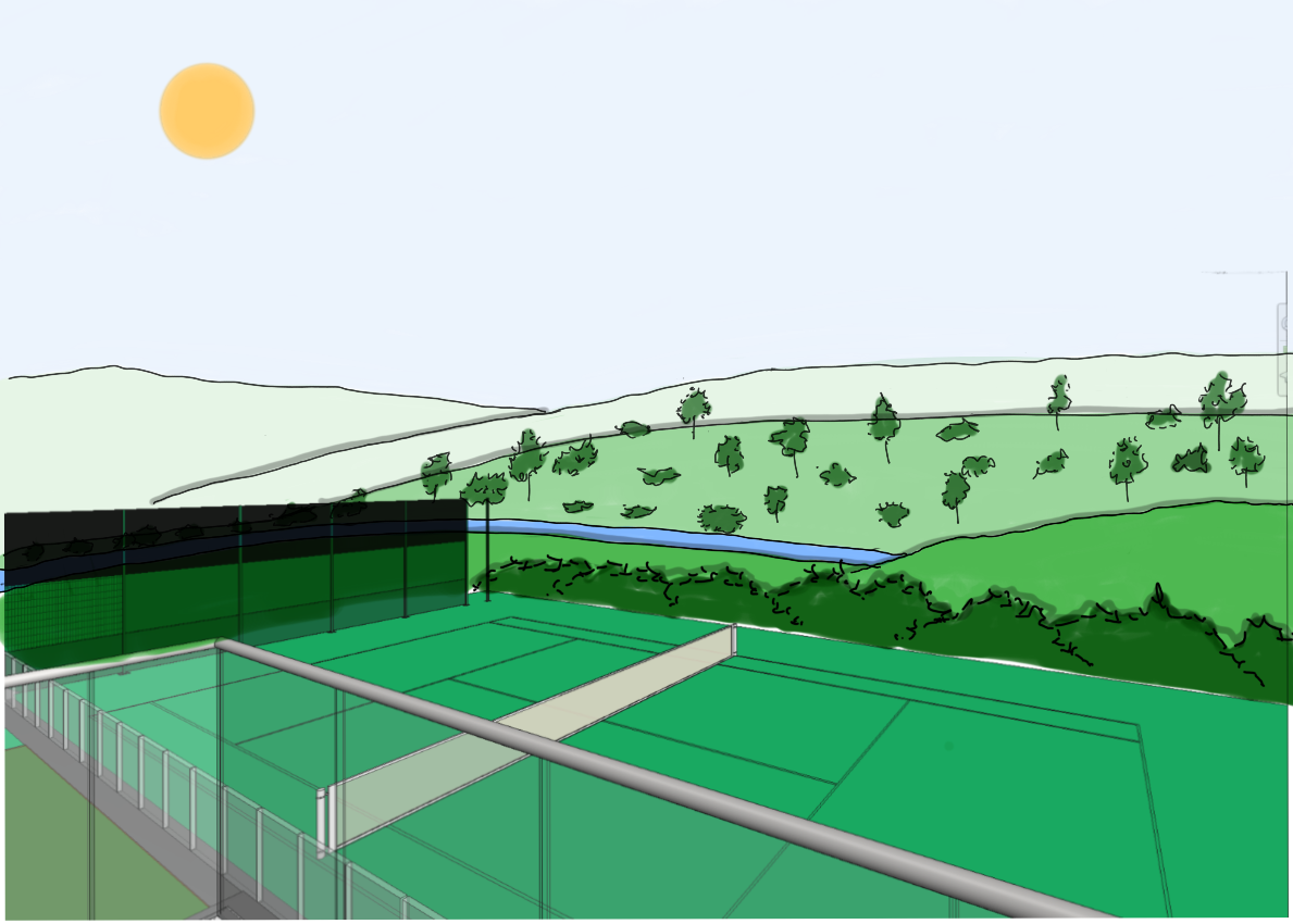 high quality photorealistic render generated directly from the provided sketch preserve the exact composition perspective proportions and layout shown in the sketch do not alter the camera angle or rearrange elements foreground features a realistic outdoor tennis court based precisely on the sketch with accurate court markings net and surface texture midground and background transition into a very gentle low relief landscape terrain should be mostly flat with only subtle smooth undulations resembling open countryside or agricultural fields rather than hills landforms must be soft continuous and smoothed out with no pronounced rises or slopes the landscape should consist of open fields low bushes hedgerows and natural greenery distributed evenly no sharp terrain changes or elevated features a calm river flows naturally through the landscape as indicated in the sketch sitting low within the terrain and integrated subtly natural summer daytime setting with the sun visible in the sky lighting should be neutral soft and realistic with even illumination and minimal shadow contrast no dramatic skies no cinematic lighting no stylization translate the sketch into a realistic visualization while strictly respecting the original intent and geometry no added elements no artistic interpretation no exaggeration ultra high resolution clean professional architectural render with natural colors realistic materials and a calm believable environment