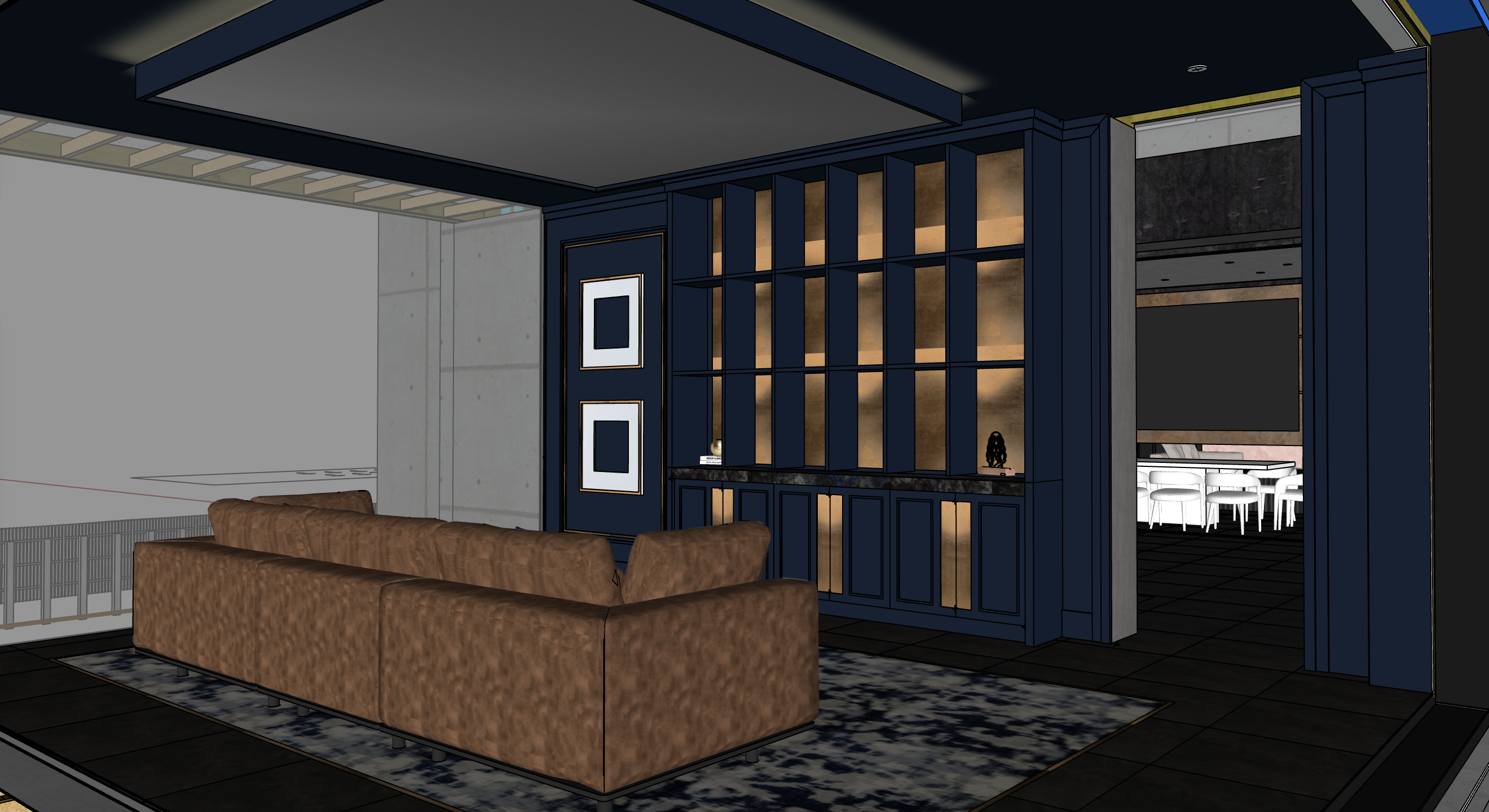 night time accent lighting in shelves deep leather sofa black and white photos in frames mirror on underside of drop ceiling structure maintain deep blue color on walls and cabinets with gold accents