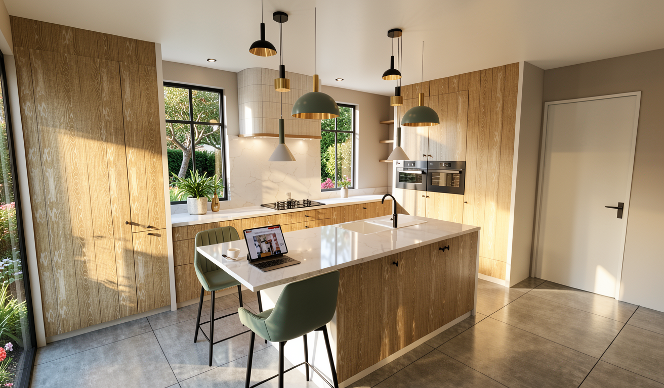 render a photorealistic 3d perspective of this kitchen in a muskoka ontario reference the current material style just enhance them light oak floors and trims light oak reveal baseboards light beige quartz countertop vertical backsplash tiles light cream color polished nickel faucet and cabinet handles small oval scones on left of the sink in cream stone and bronze frame keep geometry and materials light beige plaster hood fan with a reveal and stone trim below it white wood ceiling finish keep model geometry the same windows doors cabinets walls wall tiles kitchen island wall sconce ceiling light stone backsplash stone shelf hoodfan add a lake view to kitchen windows native to muksoka ontario add a few neutral accessories yo kitchen island and kitchen counter do not change the view only enhance the current materials and make the lighting more natural detailed textures atmospheric depth render in hyper realistic architectural visualization quality 8k resolution