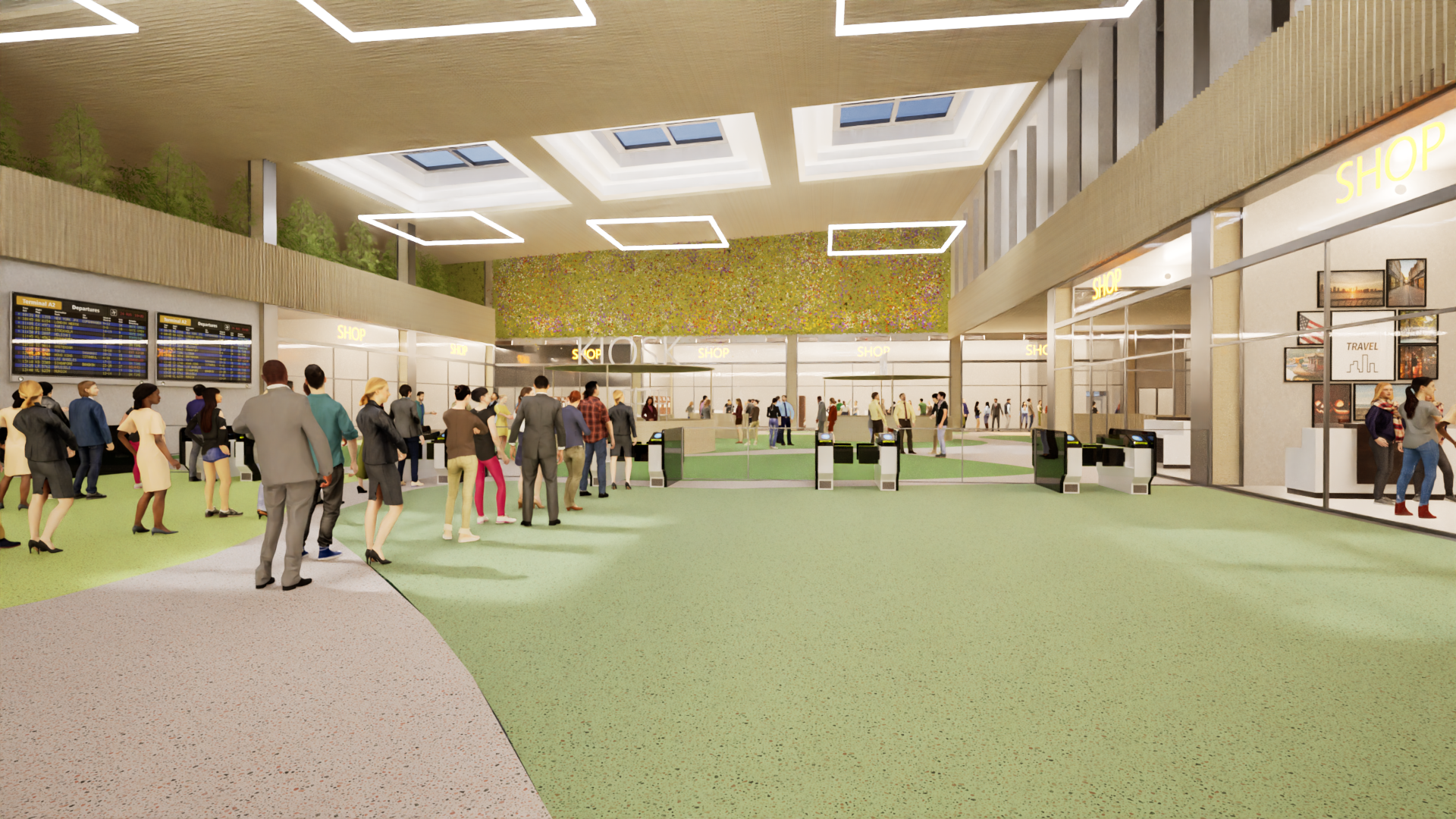 the image depicts a modern indoor space with a greenish floor ceiling lights and several storefronts and information boards people are walking and standing indicating a busy environment possibly a shopping mall or a transportation hub