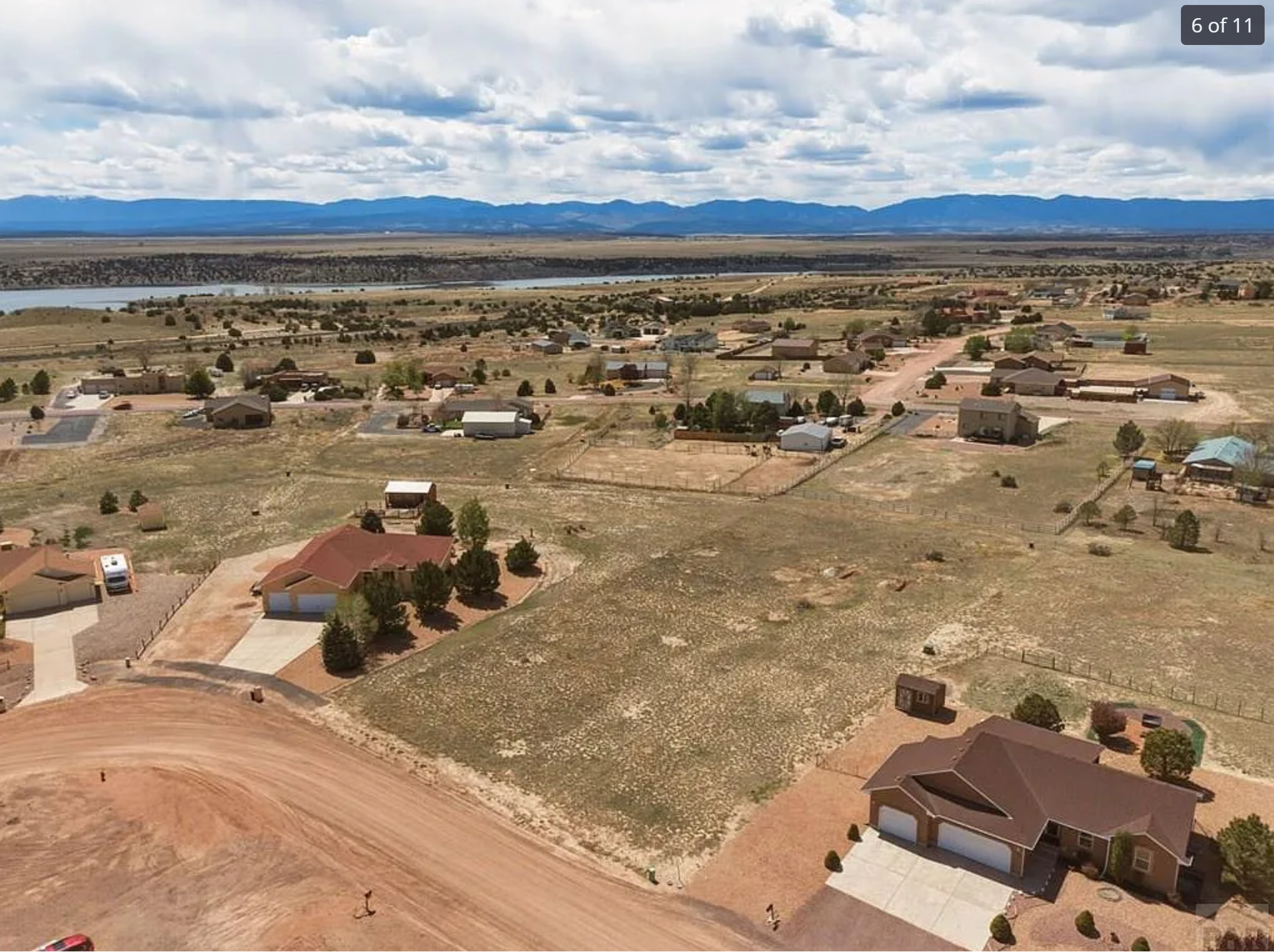 add a 2500 sf ranch style home with dark grey stucco black asphalt shingle roof black windows timber gable front entry 3 car garage single story with an outbuilding metal about 30feet by 40feet with garage door concrete driveway from road