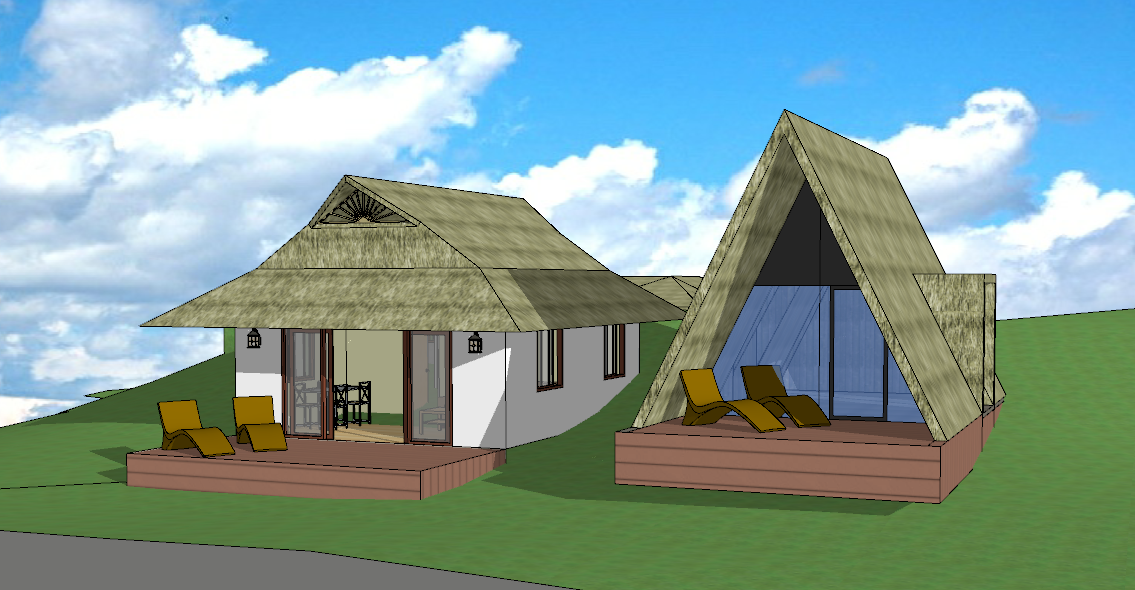 make a realistic render of these nipa huts in a resort in the philippines make it modern and make it look detailed add stairs in front porch