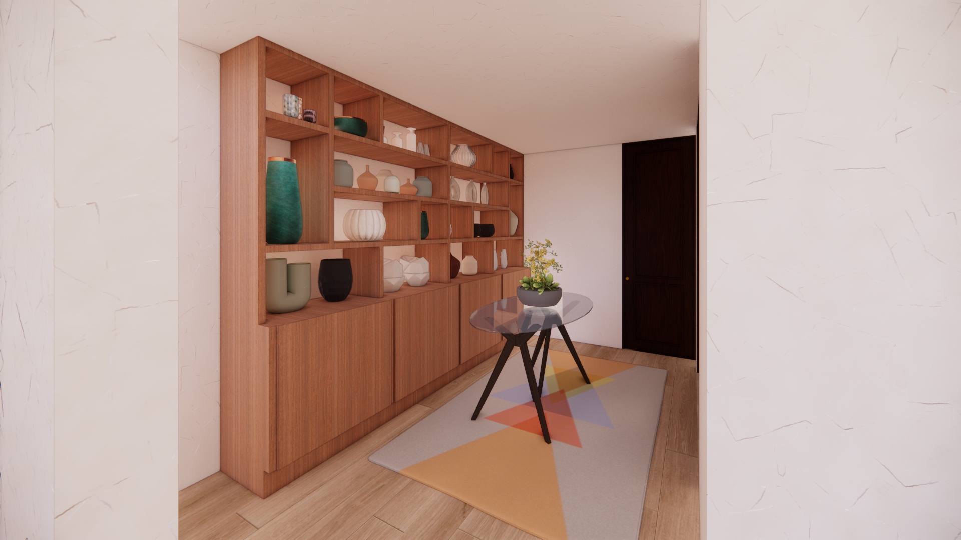 improve the textures without changing the spatial layout by adding a black lighting track to the ceiling the walls and ceiling should be white without texture