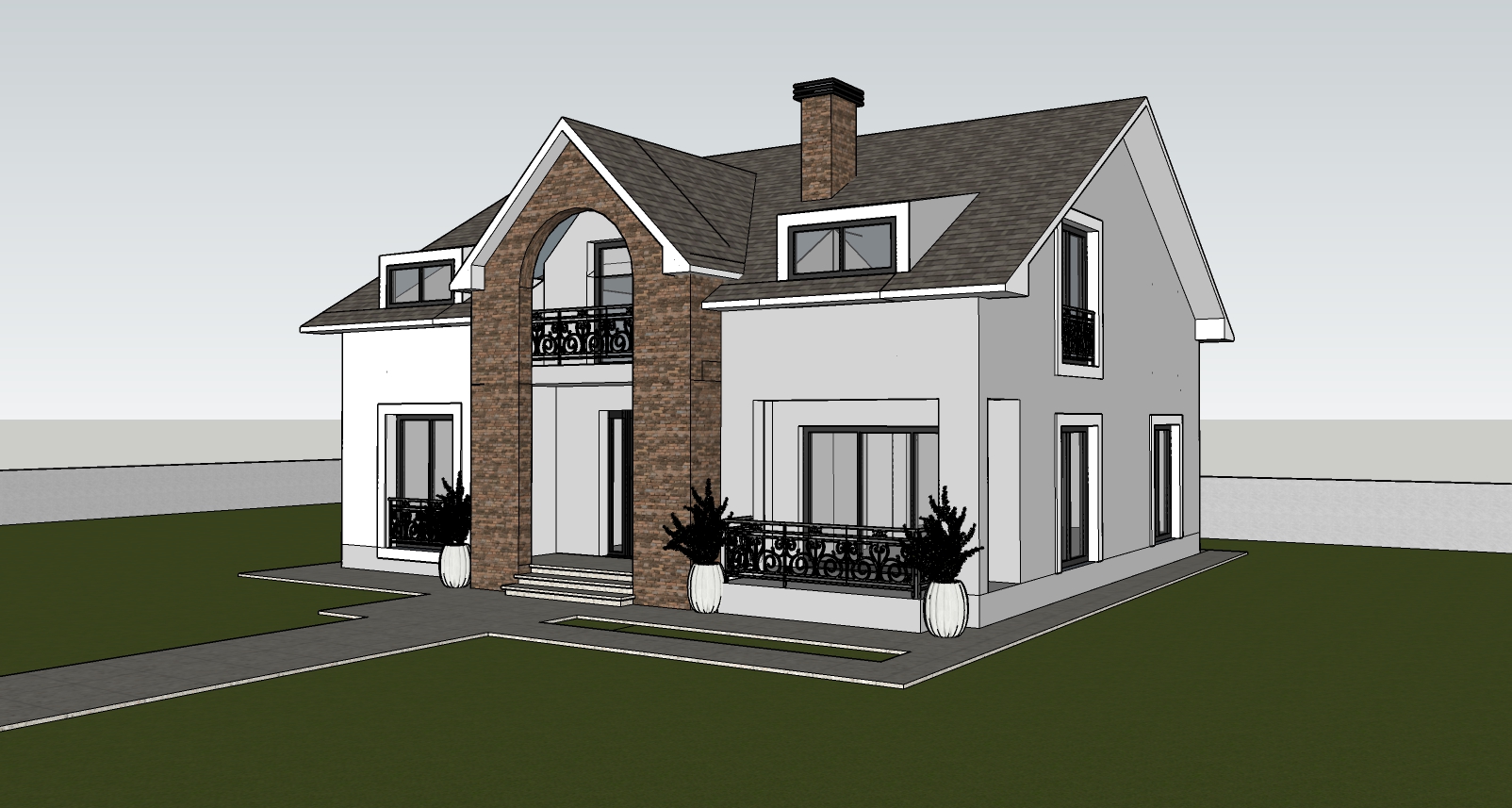 photorealistic suburban house exterior classic modern villa style clean white stucco facade warm brick accent around entrance dark gray roof tiles black metal balcony railings golden hour sunlight warm soft shadows global illumination realistic reflections on windows neat front garden landscaping trimmed grass lawn small decorative shrubs clean concrete pathway keep exact geometry keep camera angle do not change windows or volumes no design changes ultra realistic materials architectural visualization dslr photo look sharp focus high detail