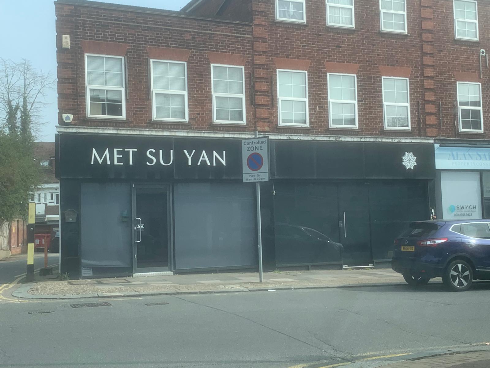 remove the street sign remove the shop sign create a fascia at the same depth as the adjacent sign finished in a pale beige plaster along with the columns between the windows