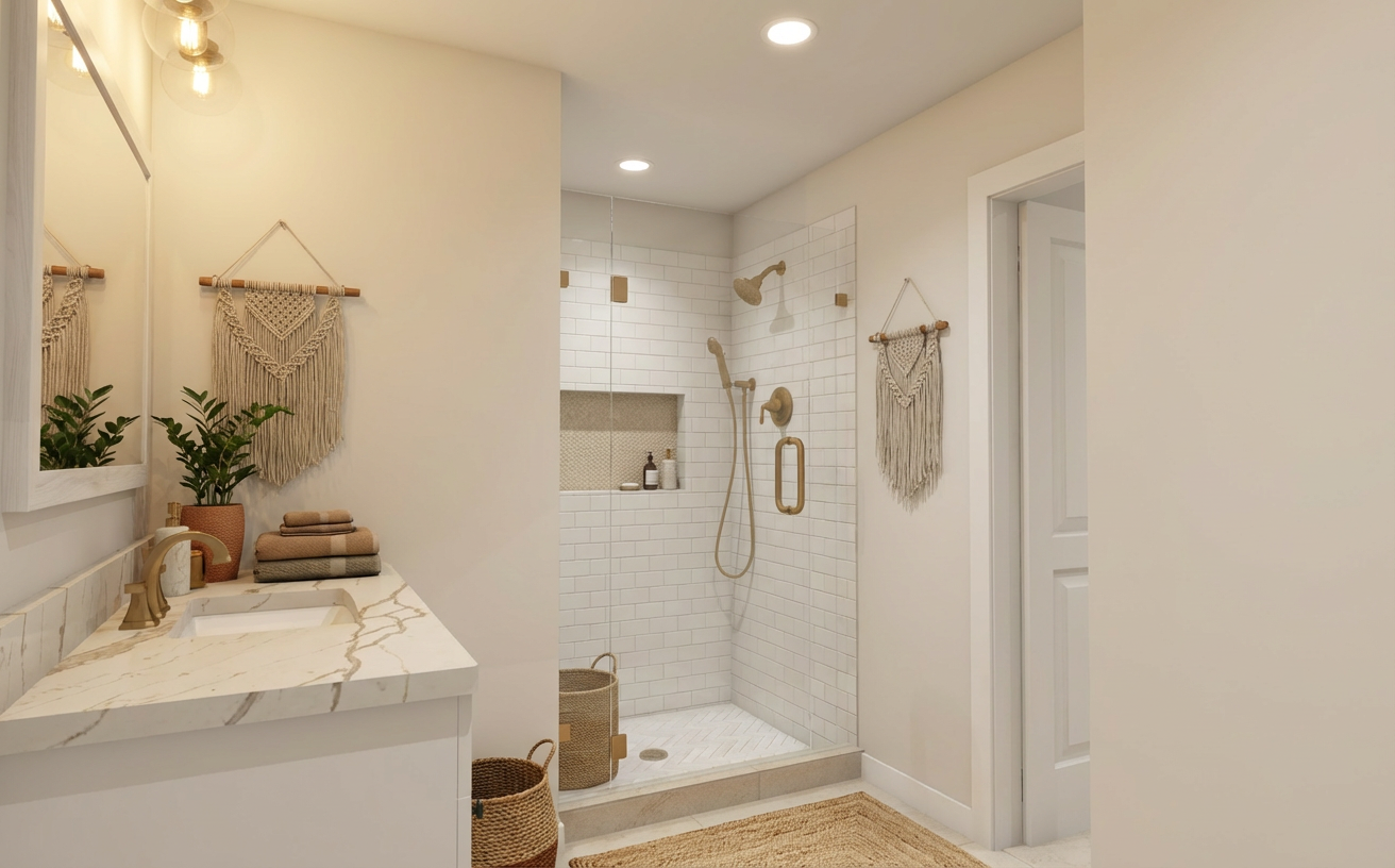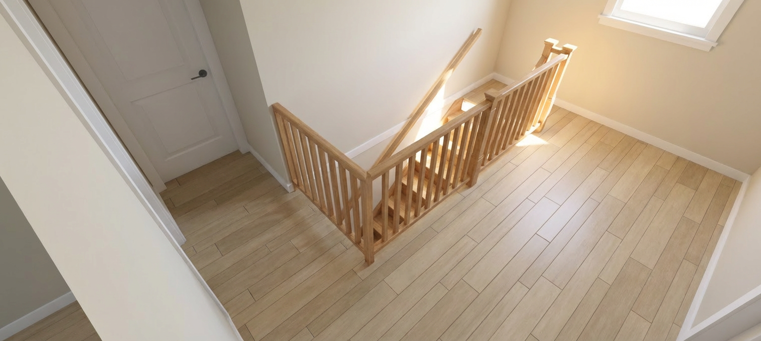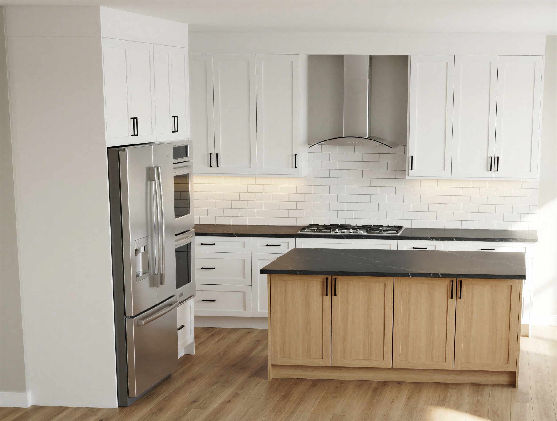 make this kitchen render photorealistic keep the exact same cabinet layout appliance positions island size and all dimensions exactly as shown only update the materials finishes and colors to the following cabinets upper wall cabinets remain bright white with shaker raised panel style doors and matte black handles lower perimeter cabinets remain bright white with matte black handles island base cabinets keep the light natural wood oak tone flat panel doors with matte black handles countertops all perimeter countertops and island top are white with gray threads shown but make it look like realistic polished quartz with subtle veining backsplash white subway tile backsplash covering the entire wall between the upper cabinets and the countertop classic 3 x6 white ceramic subway tiles laid in a horizontal brick pattern with light grey grout flooring replace current dark floor with light brown warm oak luxury vinyl plank flooring realistic wood grain texture planks running lengthwise into the kitchen appliances stainless steel french door refrigerator keep as shown stainless steel double wall oven keep as shown stainless steel gas cooktop on the perimeter counter keep as shown stainless steel curved range hood above cooktop keep as shown walls light grey greige wall color above and around cabinets lighting add warm under cabinet led lighting illuminating the subway tile backsplash bright and well lit overall photorealistic lighting with natural light coming from the right side style photorealistic rendering quality not a sketch or illustration modern farmhouse transitional style clean bright and inviting feel