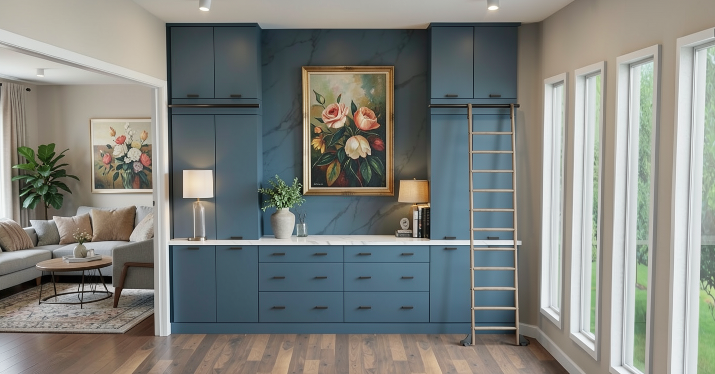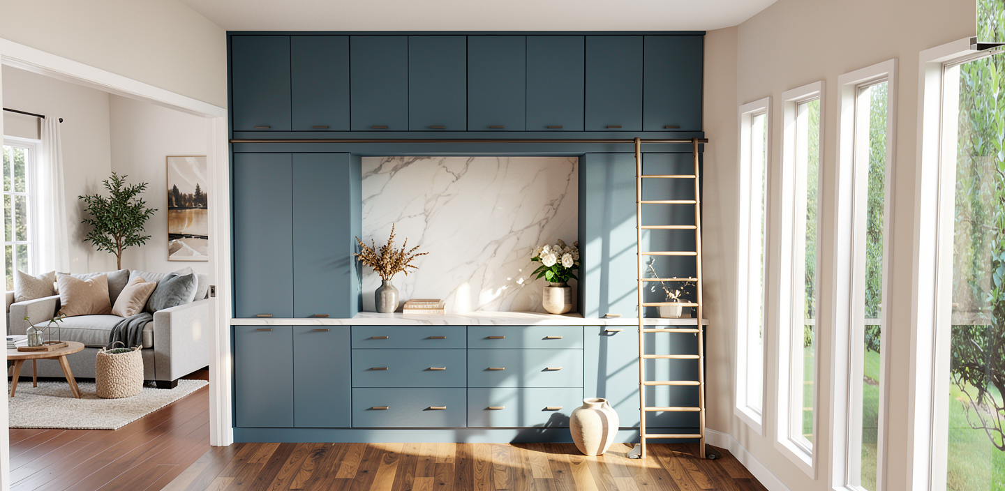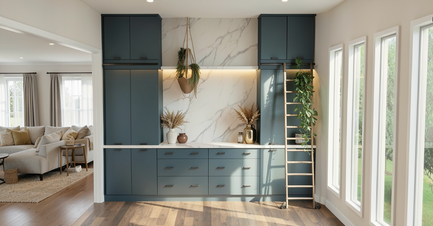 make this kitchen render photorealistic keep the exact same cabinet layout appliance positions island size and all dimensions exactly as shown only update the materials finishes and colors to the following cabinets upper wall cabinets remain bright white with shaker raised panel style doors and matte black handles lower perimeter cabinets remain bright white with matte black handles island base cabinets keep the light natural wood oak tone flat panel doors with matte black handles countertops all perimeter countertops and island top are white with gray threads shown but make it look like realistic polished quartz with subtle veining backsplash white subway tile backsplash covering the entire wall between the upper cabinets and the countertop classic 3 x6 white ceramic subway tiles laid in a horizontal brick pattern with light grey grout flooring replace current dark floor with light brown warm oak luxury vinyl plank flooring realistic wood grain texture planks running lengthwise into the kitchen appliances stainless steel french door refrigerator keep as shown stainless steel double wall oven keep as shown stainless steel gas cooktop on the perimeter counter keep as shown stainless steel curved range hood above cooktop keep as shown walls light grey greige wall color above and around cabinets lighting add warm under cabinet led lighting illuminating the subway tile backsplash bright and well lit overall photorealistic lighting with natural light coming from the right side style photorealistic rendering quality not a sketch or illustration modern farmhouse transitional style clean bright and inviting feel