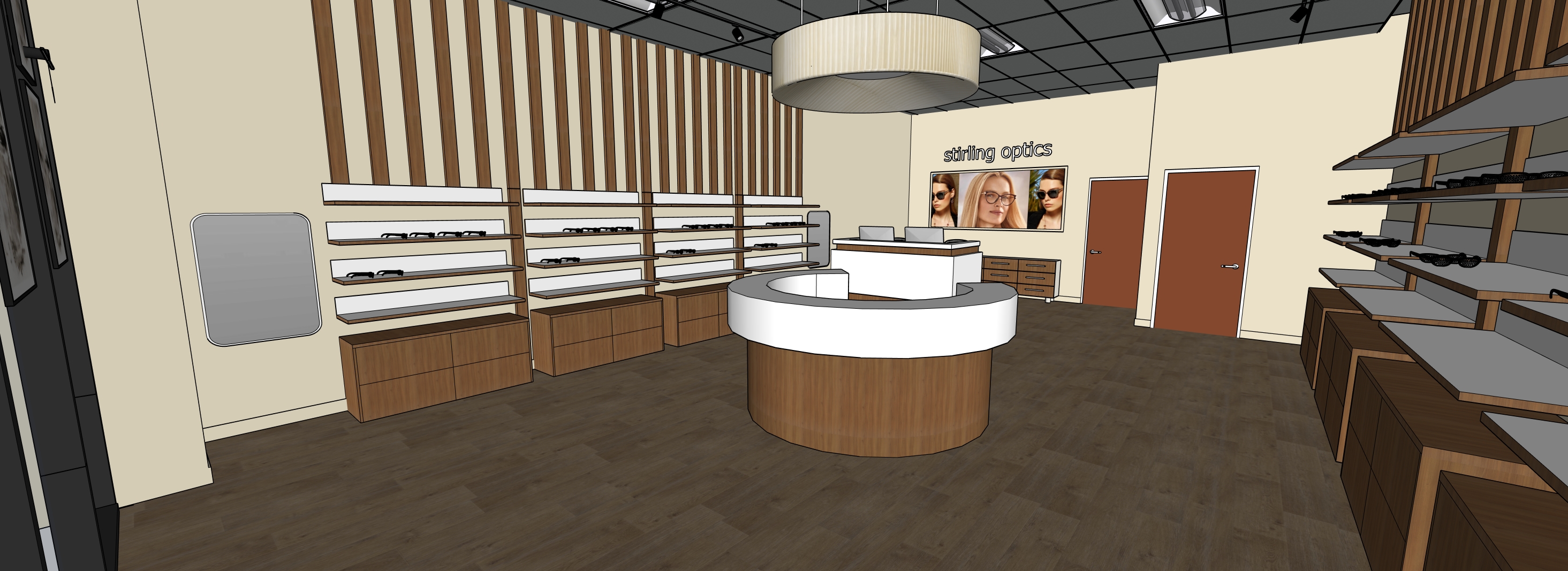 render the image with bright warm lighting to the interior allow for shadows to enter the shopfront ensure the environment feels suitable for eye glasses display add soft texture to the timber elements