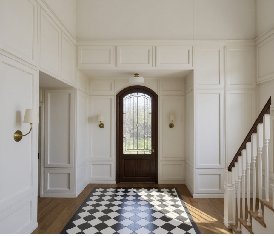 remove the flush mount light fixture above the entry door remove the checker tile and replace with wood flooring