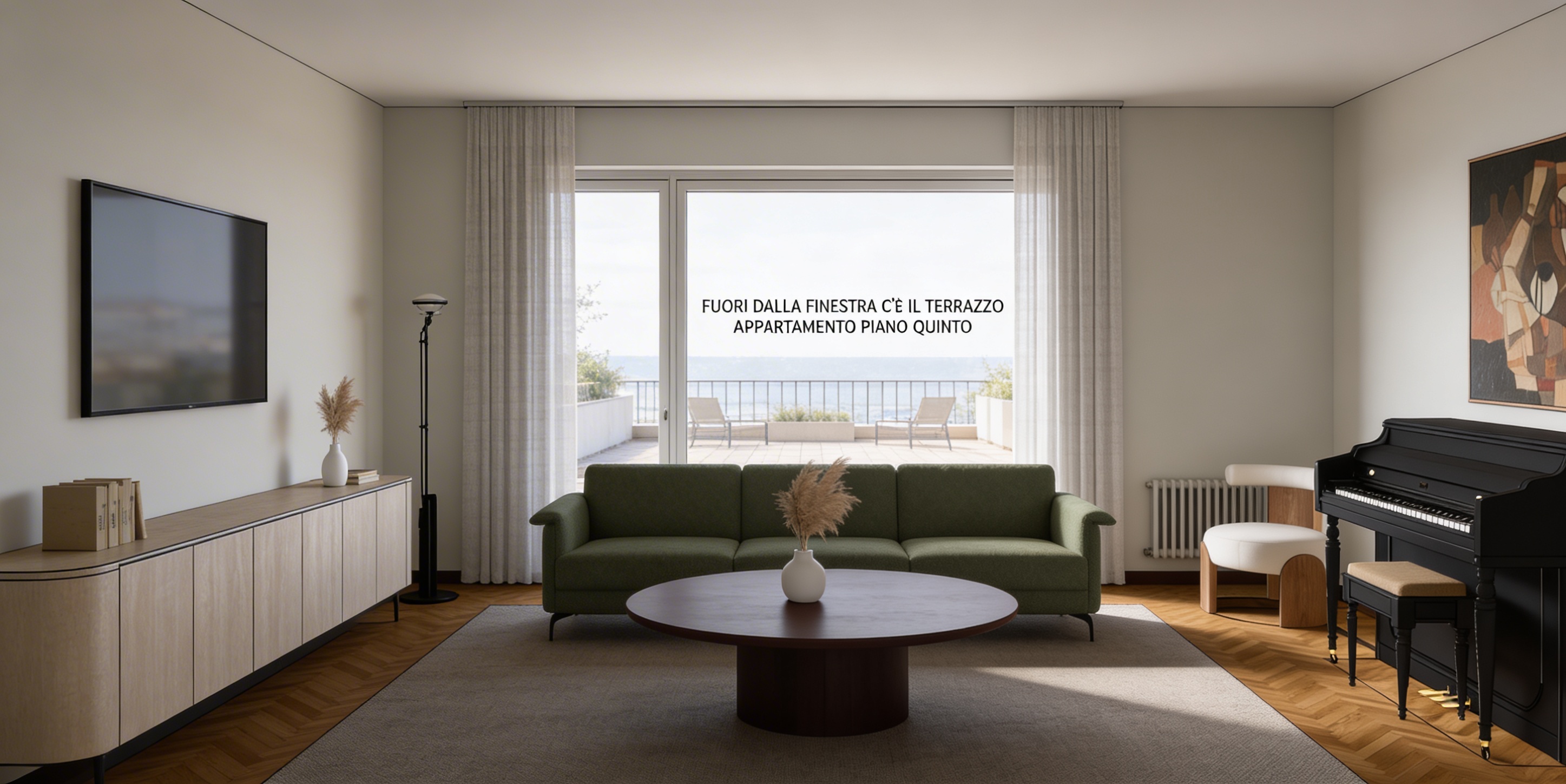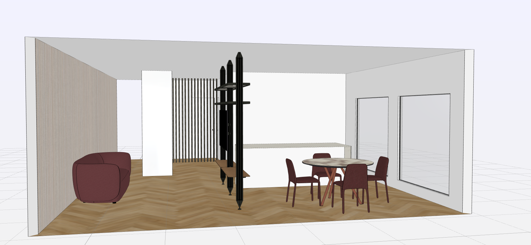 render a modern interior space with a cozy and elegant atmosphere use a warm light beige for the walls create a herringbone wood floor in a natural oak finish design a plush burgundy loveseat on the left side include a sleek dark brown vertical slatted partition in the center background add a round dining table with a marble top supported by bronze legs surrounded by four burgundy upholstered chairs on the right incorporate large glass windows on the right wall allowing soft natural light to enhance the serene ambiance